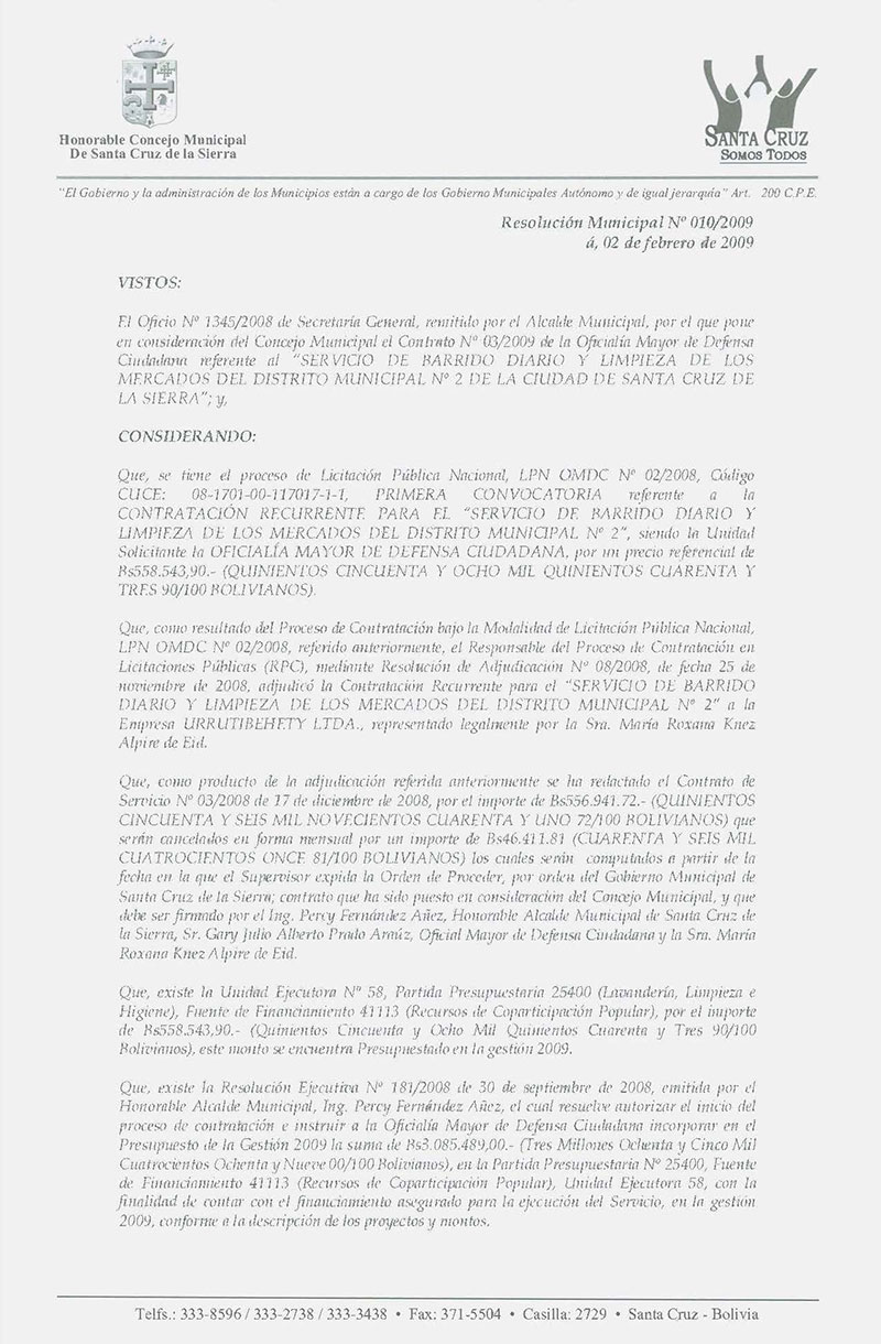 Aprueba el Contrato Oficialía Mayor de Defensa Ciudadana N° 003/2009, referente al "Servicio de Barrido Diario y Limpieza de los Mercados del Distrito Municipal N° 2, de la Ciudad de Santa Cruz de la sierra, adjudicado a la Empresa URRUTIBEHETY Ltda., por un monto de Bs. 556.941,72.