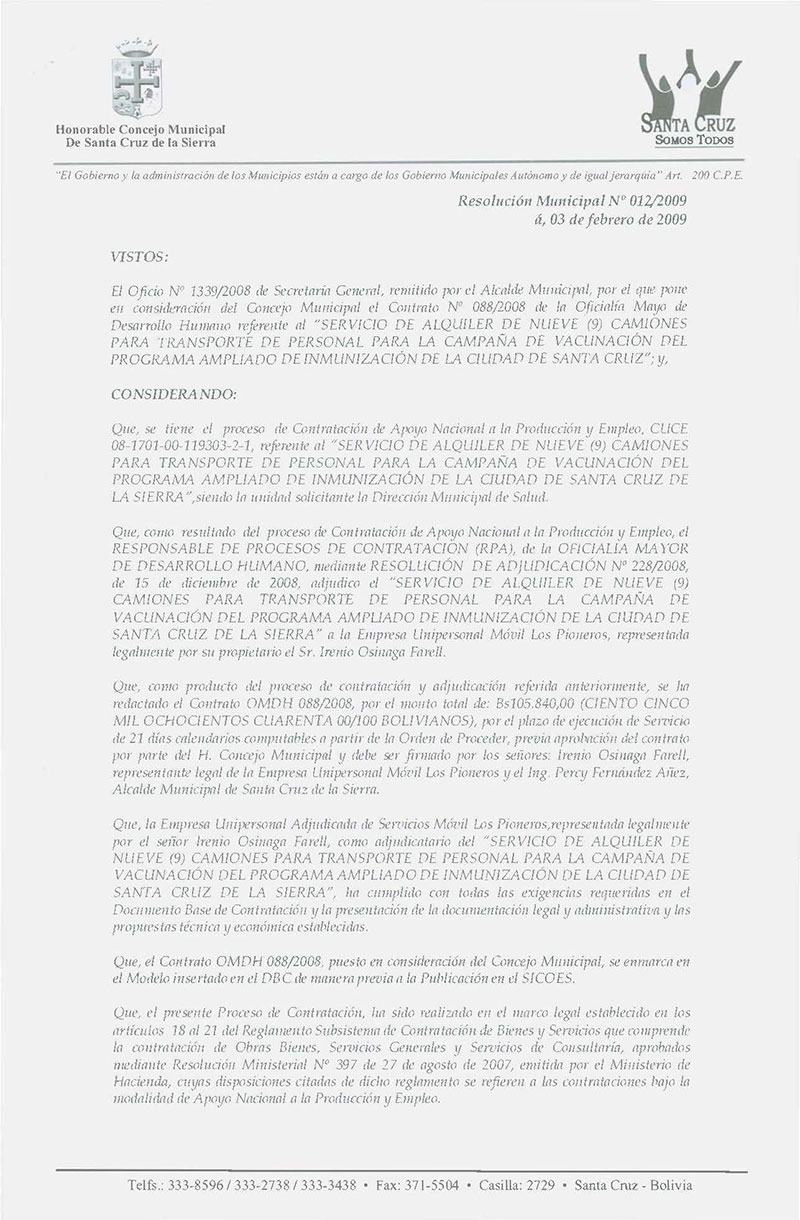 Aprueba el Contrato Oficialía Mayor de Desarrollo Humano N° 088/2008, referente al "Servicio de alquiler de nueve camiones para transporte de personal para la Campaña de Vacunación del Programa Ampliado de Inmunización de la ciudad de Santa Cruz de la Sierra.