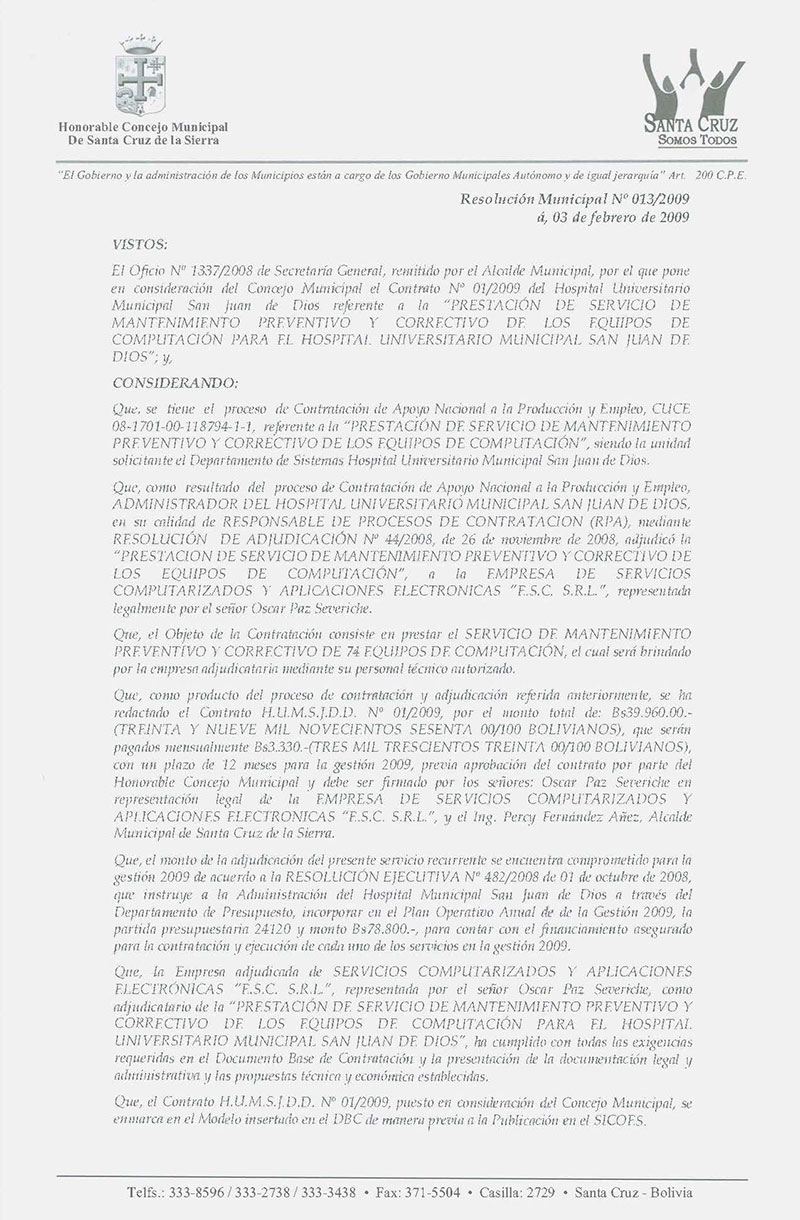 Dispone la Aprobación del Contrato Hospital Universitario Municipal San Juan de Dios N°01/2009, referente a la "Prestación de Servicio de Mantenimiento Preventivo y Correctivo de los Equipos de Computación para el Hospital Universitario Municipal San Juan de Dios.