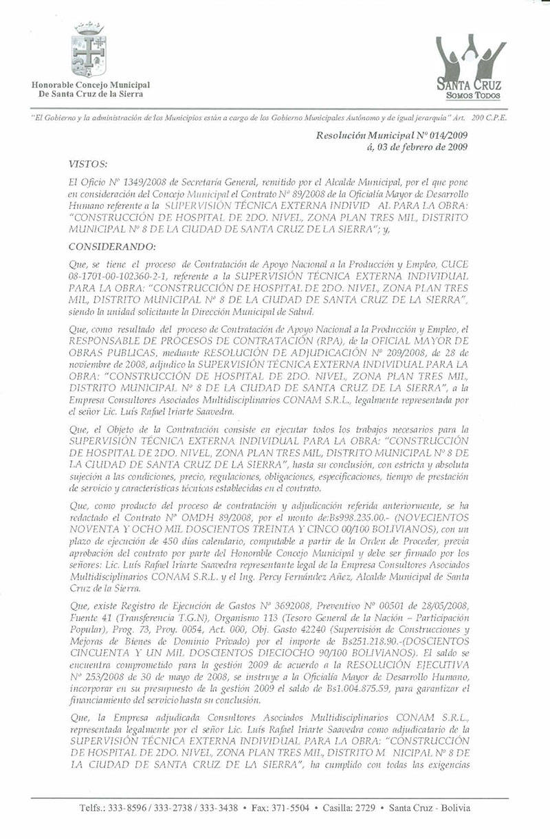 Aprueba el Contrato OMDH No 89/2008 por el monto de Bs. 998,235,00 referente a la "Supervisión Técnica externa individual para la Obra: "Construcción del Hospital 2do. Nivel Plan Tres Mil Distrito Municipal No 8.