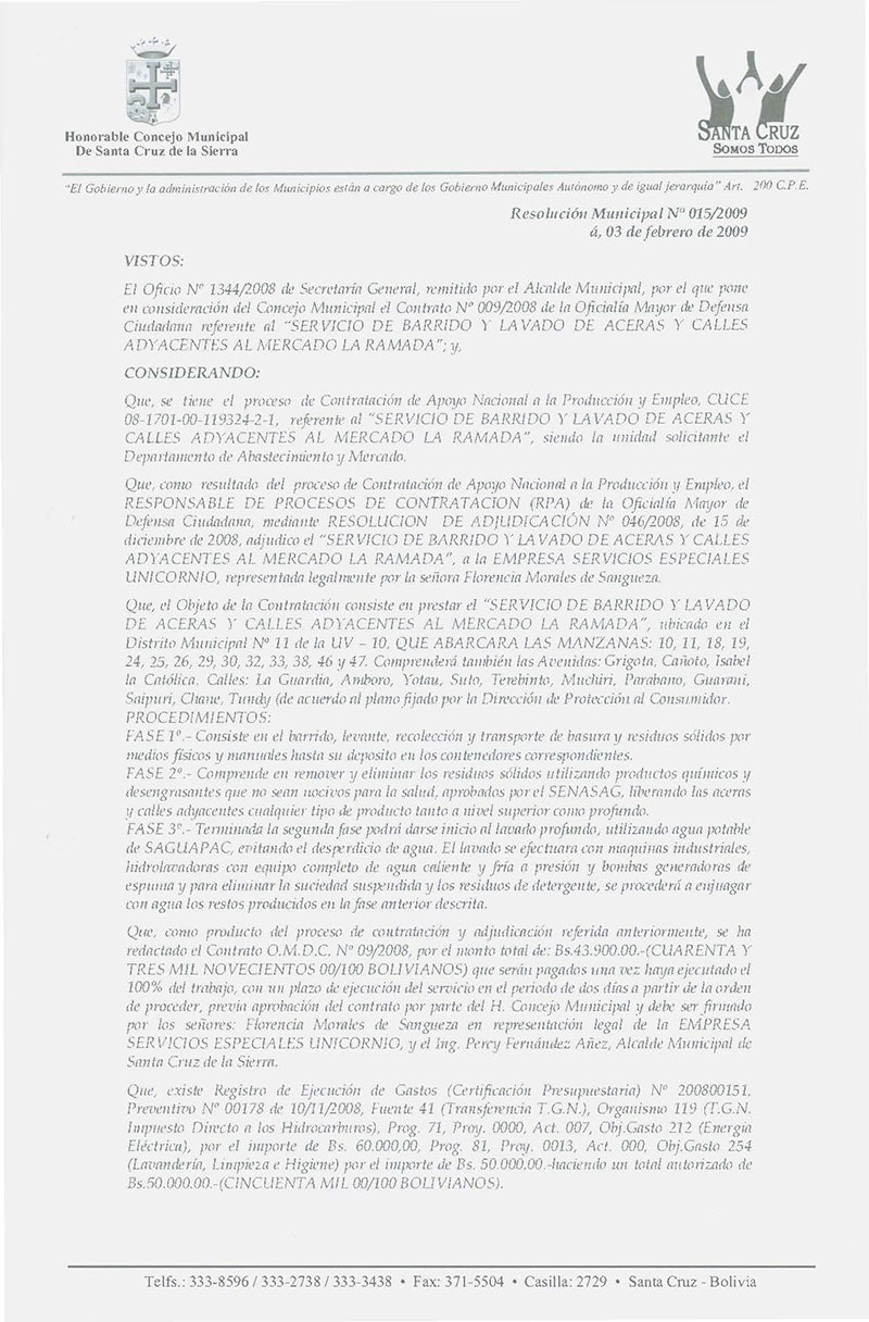 Aprueba el Contrato Oficialía Mayor de Defensa Ciudadana N° 09/2009, por el monto de Bs. 43,900.00.- referente al "Servicio de Barrido y Lavado de Aceras y Calles Adyacentes al Mercado la Ramada".