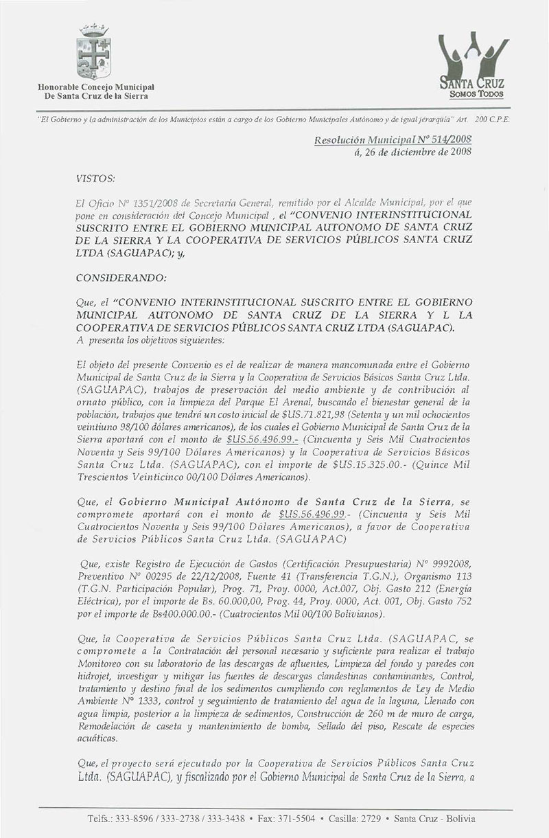 Aprueba el “CONVENIO INTERINSTITUCIONAL SUSCRITO ENTRE EL GOBIERNO AUTÓNOMO MUNICIPAL DE SANTA CRUZ DE LA SIERRA Y LA COOPERATIVA DE SERVICIOS PÚBLICOS SANTA CRUZ LTDA (SAGUAPAC)” para ejecutar trabajos de preservación del medio ambiente y de contribución al ornato público, con la limpieza del Parque El Arenal.