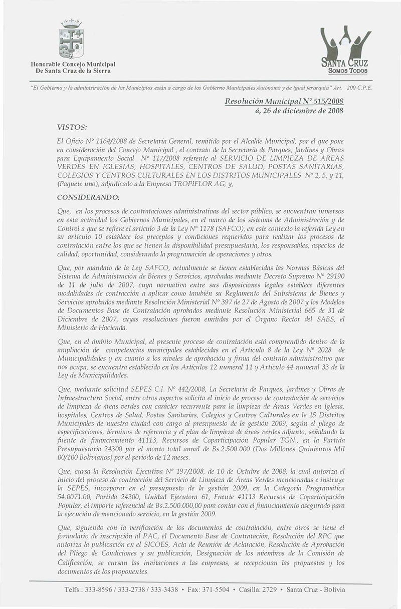 Aprueba el CONTRATO de la Secretaria de Parques, Jardines y Obras para Equipamiento Social Nº 117/2008 referente al SERVICIO DE LIMPIEZA DE AREAS VERDES EN IGLESIAS, HOSPITALES, CENTROS DE SALUD, POSTAS SANITARIAS, COLEGIOS Y CENTROS CULTURALES EN LOS DISTRITOS MUNICIPALES Nº 2, 5 y 11 DE LA CIUDAD DE SANTA CRUZ DE LA SIERRA por un monto de Bs.377.942,77.- (Trescientos Setenta y Siete Mil Novecientos Cuarenta y Dos 77/100 Bolivianos), adjudicado a la Empresa TROPIFLOR AG.
