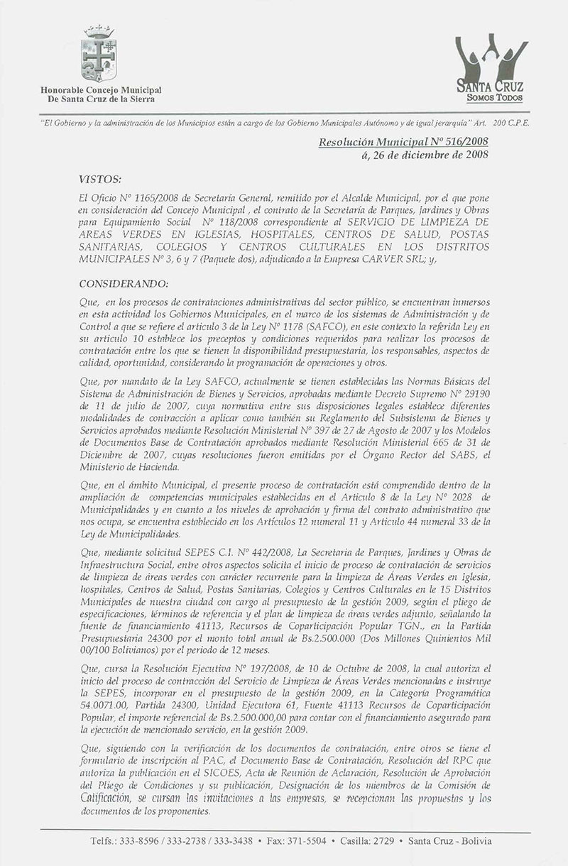 Aprueba el CONTRATO de la Secretaría de Parques, Jardines y Obras para Equipamiento Social Nº 118/2008 referente al SERVICIO DE LIMPIEZA DE AREAS VERDES EN IGLESIAS, HOSPITALES, CENTROS DE SALUD, POSTAS SANITARIAS, COLEGIOS Y CENTROS CULTURALES EN LOS DISTRITOS MUNICIPALES Nº 3, 6 y 7 DE LA CIUDAD DE LA CIUDAD DE SANTA CRUZ DE LA SIERRA, por un monto de Bs.591.064,80.- (Quinientos Noventa y Un Mil Sesenta y Cuatro 80/100 Bolivianos), adjudicado a la Empresa CARVER SRL.