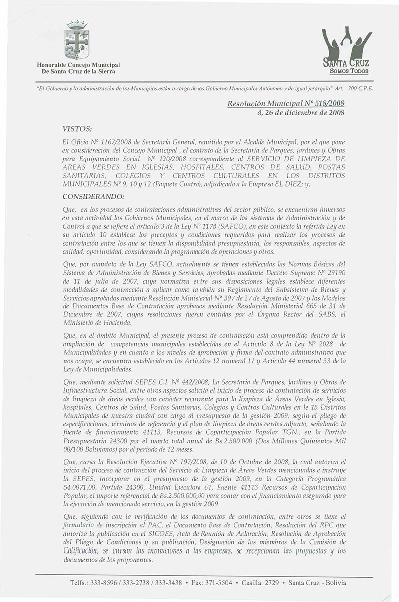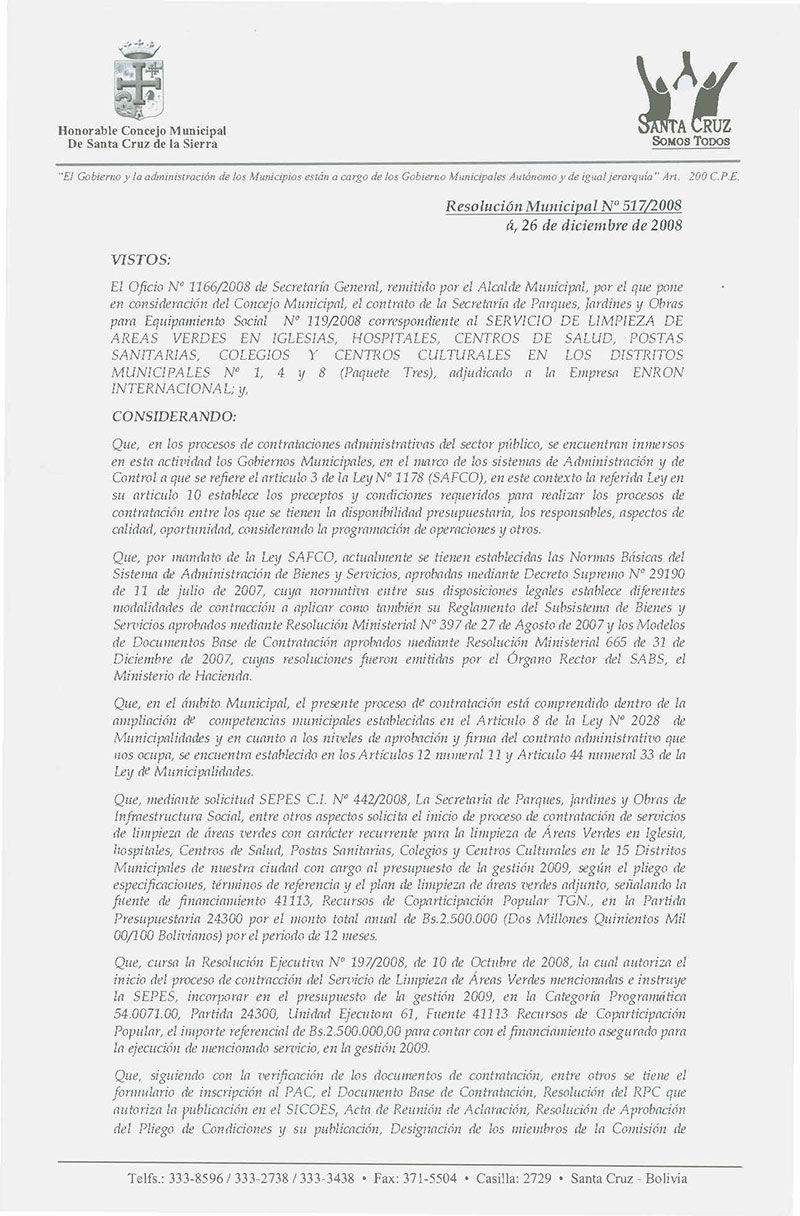Aprueba el contrato de la Secretaría de Parques, Jardines y Obras para Equipamiento Social Nº 119/2008 referente al SERVICIO DE LIMPIEZA DE AREAS VERDES EN IGLESIAS, HOSPITALES, CENTROS DE SALUD, POSTAS SANITARIAS, COLEGIOS Y CENTROS CULTURALES EN LOS DISTRITOS MUNICIPALES Nº 1, 4 y 8 DE LA CIUDAD DE SANTA CRUZ DE LA SIERRA, por un monto de Bs.580.244,67.- (Quinientos Ochenta Mil Doscientos Cuarenta y Cuatro 67/100 Bolivianos), adjudicado a la Empresa ENRON INTERNACIONAL LTDA.