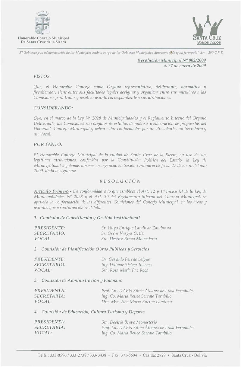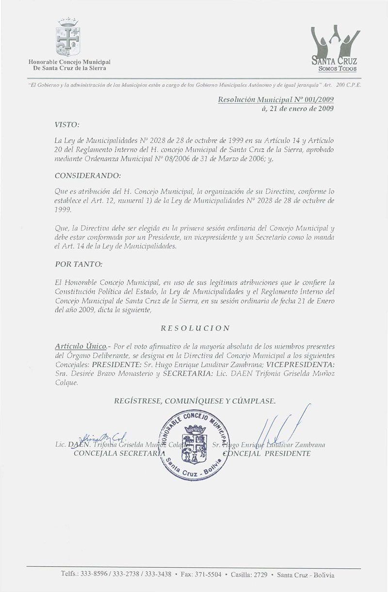 Designación de la Directiva del H. Concejo Municipal PRESIDENTE: Sr. Hugo Enrique Landivar Zambrana VICEPRESIDENTA: Sra. Desiree Bravo Monasterio SECRETARIA: Lic. DAEN T. Griselda Muñoz Colque.