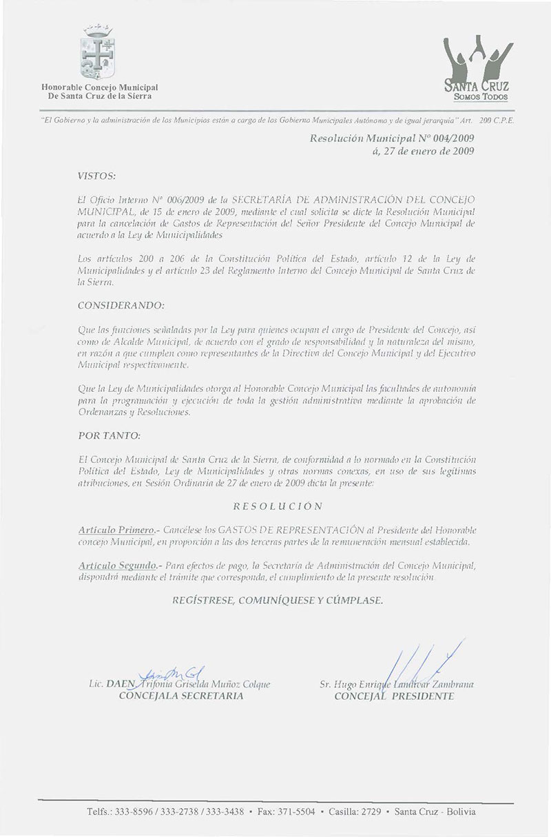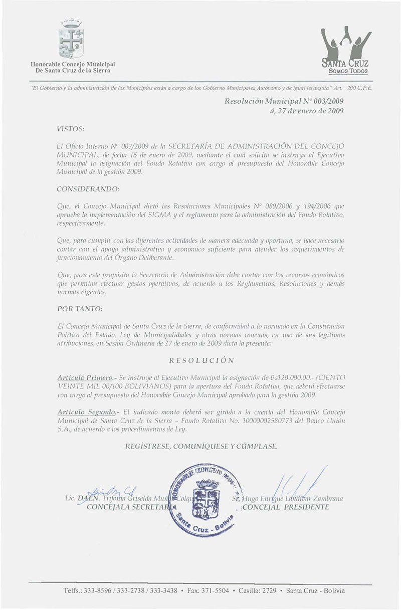 Se instruye al ejecutivo Municipal la asignación de Bs. 120.000,00.- para la Apertura de un Fondo Rotativo para el Honorable Concejo Municipal aprobado para la gestión 2009.