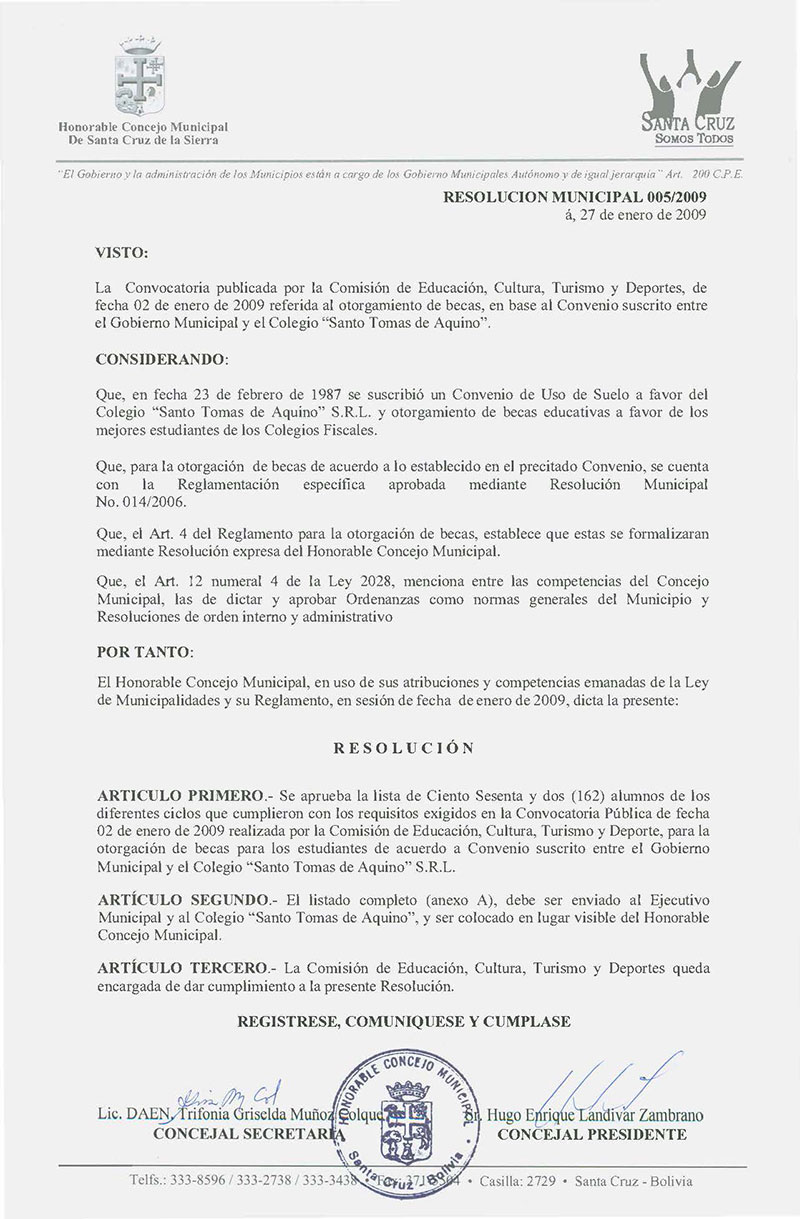 Aprueba la lista de 162 alumnos que cumplieron con los requisitos exigidos en la Convocatoria Pública, de fecha 02 de enero de 2009, para otorgación de Becas a los estudiantes de acuerdo al Convenio suscrito entre le Gobierno Municipal y el Colegio "Santo Tomas de Aquino" S.R.L.