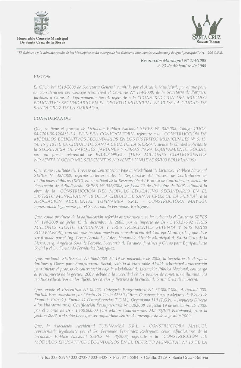 Aprueba el Contrato Nº 144/2008, de la Secretaría de Parques, Jardines y Obras de Equipamiento Social, referente a la “CONSTRUCCIÓN DEL MÓDULO EDUCATIVO SECUNDARIO EN EL DISTRITO MUNICIPAL Nº 10 DE LA CIUDAD DE SANTA CRUZ DE LA SIERRA”, por el valor de Bs. 3.153.376,92.- (TRES MILLONES CIENTO CINCUENTA Y TRES MIL TRESCIENTOS SETENTA Y SEIS 92/100 BOLIVIANOS), adjudicado a la Asociación Accidental TUPINAMBA S.R.L. – CONSTRUCTORA MAYUGI.
