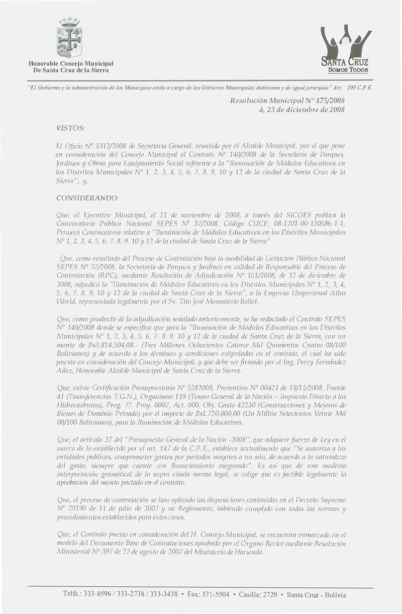 Aprueba el Contrato Nº 140/2008 de la Secretaría de Parques, Jardines y Obras para Equipamiento Social referente a la “Iluminación de Módulos Educativos en los Distritos Municipales Nº 1, 2, 3, 4, 5, 6, 7, 8, 9, 10 y 12 de la ciudad de Santa Cruz de la Sierra”, por el monto de Bs 3.814.504,08 (TRES MILLONES OCHOCIENTOS CATORCE MIL QUINIENTOS CUATRO 08/100 BOLIVIANOS), adjudicado a la Empresa Unipersonal Atlas World.