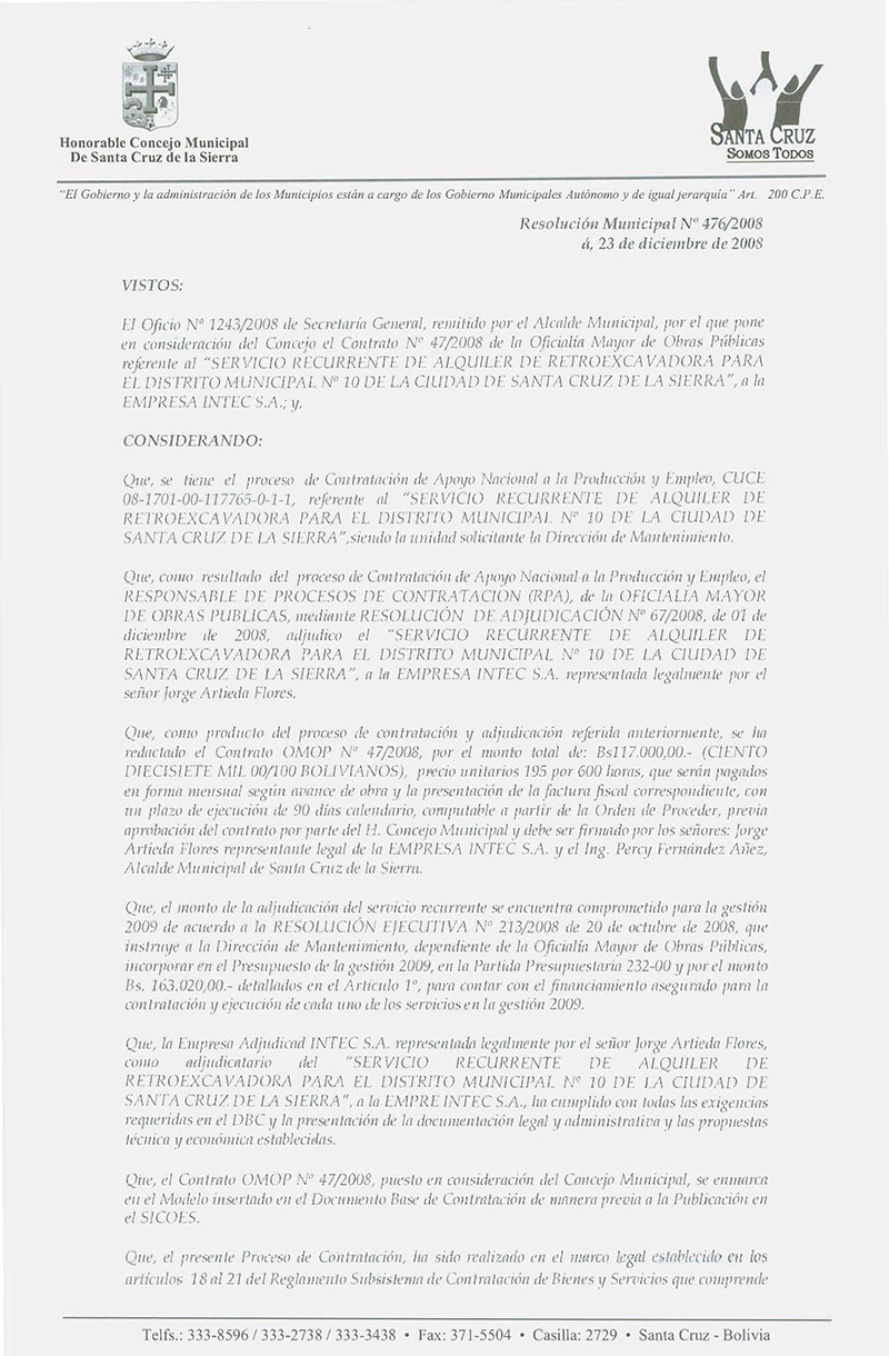 Aprueba el Contrato Nº 47/2008 de la Oficialía Mayor de Obras Públicas referente al “SERVICIO RECURRENTE DE ALQUILER DE RETROEXCAVADORA PARA EL DISTRITO MUNICIPAL Nº 10 DE LA CIUDAD DE SANTA CRUZ DE LA SIERRA”, por el monto total de 117.000,00(CIENTO DIECISIETE MIL 00/100 BOLIVIANOS), adjudicado a la EMPRESA INTEC S.A.