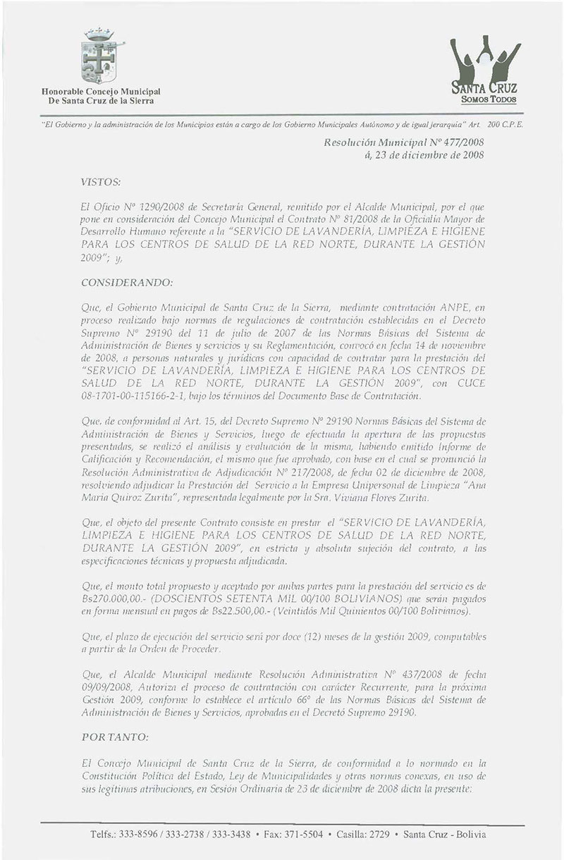 Aprueba el Contrato Nº 81/2008 de la Oficialía Mayor de Desarrollo Humano referente al “SERVICIO DE LAVANDERÍA, LIMPIEZA E HIGIENE PARA LOS CENTROS DE SALUD DE LA RED NORTE, DURANTE LA GESTIÓN 2009, adjudicado a la Empresa Unipersonal de Limpieza “Ana Maria Quiroz Zurita”, por un monto de Bs. 270.000,00.- (DOSCIENTOS SETENTA MIL 00/100 BOLIVIANOS).