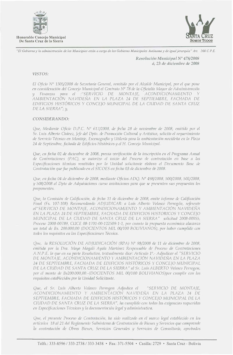 Aprueba el Contrato Nº 78/2008 de la Oficialía Mayor de Administración y Finanzas para el “SERVICIO DE MONTAJE, ACONDICIONAMIENTO Y AMBIENTACIÓN NAVIDEÑA EN LA PLAZA 24 DE SEPTIEMBRE, FACHADA DE EDIFICIOS HISTÓRICOS Y CONCEJO MUNICIPAL DE LA CIUDAD DE SANTA CRUZ DE LA SIERRA” por el monto de Bs. 200.000,00.-(DOSCIENTOS MIL 00/100 BOLIVIANOS).
