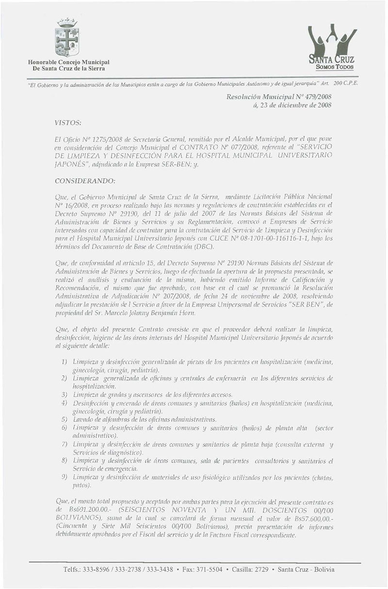 Aprueba el CONTRATO Nº 077/2008, referente al “SERVICIO DE LIMPIEZA Y DESINFECCIÓN PARA EL HOSPITAL MUNICIPAL UNIVERSITARIO JAPONÉS”, adjudicado a la Empresa Unipersonal SER-BEN, por un monto de Bs. 691.200.00.- (SEISCIENTOS NOVENTA Y UN MIL DOSCIENTOS 00/100 BOLIVIANOS).