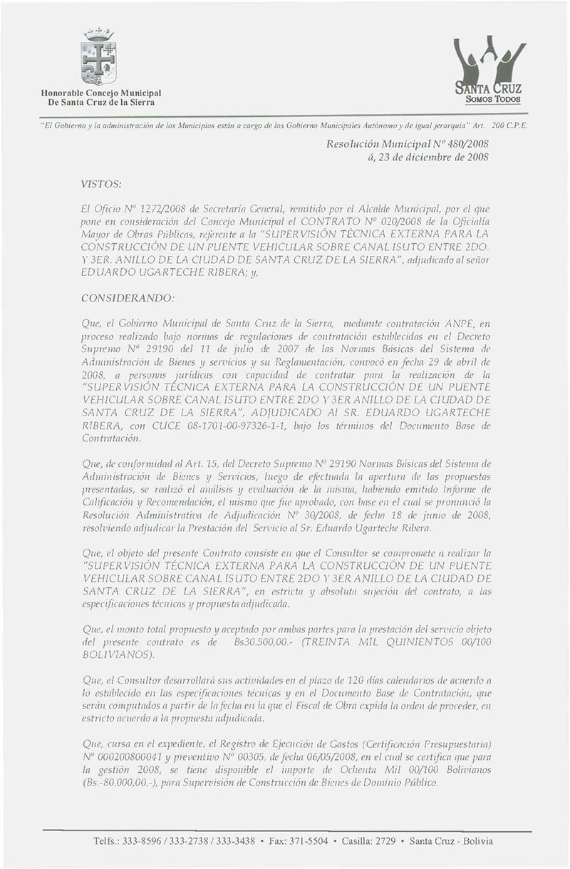 Aprueba el Contrato Nº 020/2008 de la Oficialía Mayor de Obras Públicas, referente a la “SUPERVISIÓN TÉCNICA EXTERNA PARA LA CONSTRUCCIÓN DE UN PUENTE VEHICULAR SOBRE CANAL ISUTO ENTRE 2do.Y 3er. ANILLO DE LA CIUDAD DE SANTA CRUZ DE LA SIERRA”, adjudicado al señor EDUARDO UGARTECHE RIBERA, por un monto de Bs. 30.500,00.- (TREINTA MIL QUINIENTOS 00/100 BOLIVIANOS).