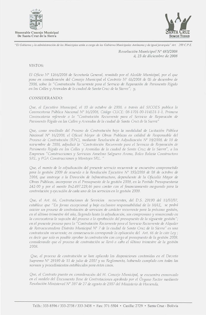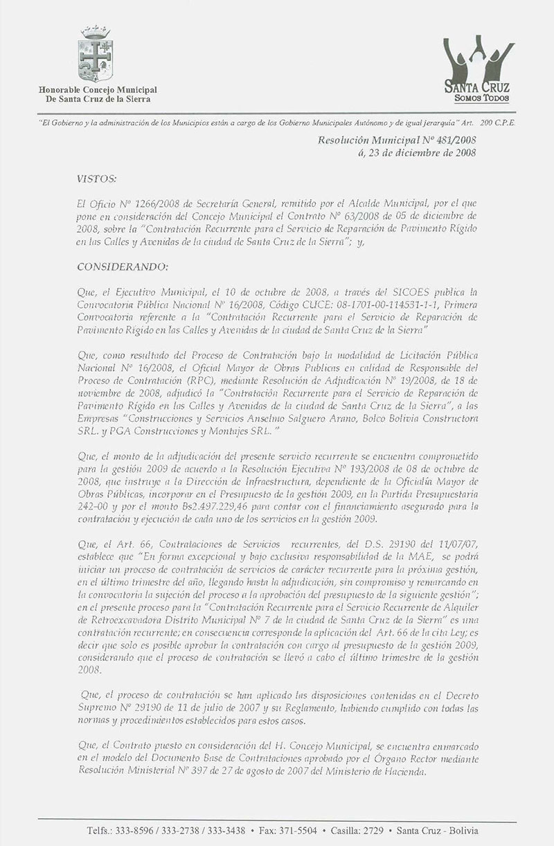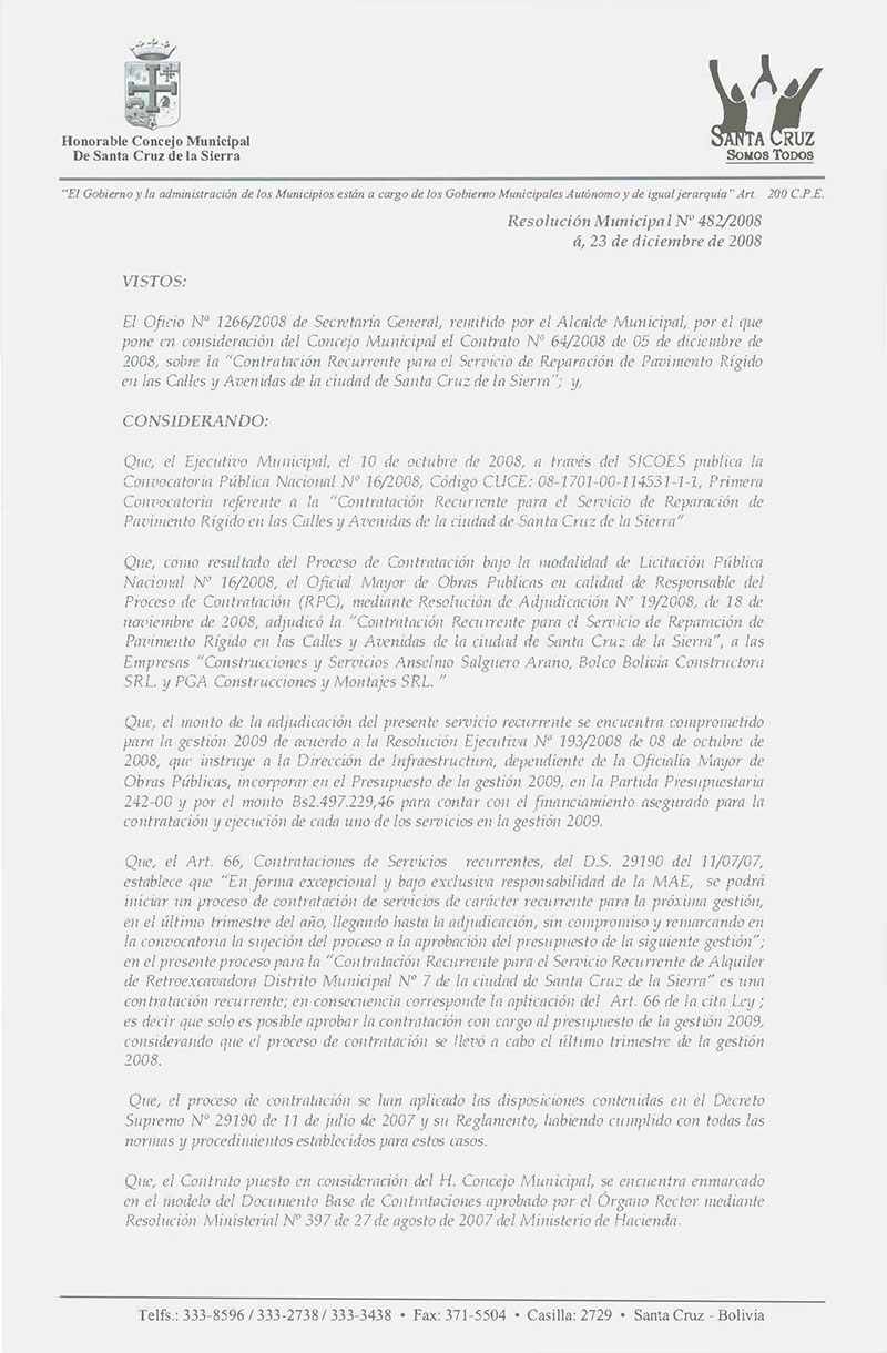 Aprueba el Contrato Nº 63/2008 de la Oficialía Mayor de Obras Públicas, referente a la“Contratación Recurrente para el Servicio de Reparación de Pavimento Rígido en las Calles y Avenidas de la ciudad de Santa Cruz de la Sierra”, (Primer Tramo) por el monto de Bs. 779.165,60.- (SETECIENTOS SETENTA Y NUEVE MIL CIENTO SESENTA Y CINCO CON 60/100 BOLIVIANOS), adjudicado a la Empresa Construcciones y Servicios Anselmo Salguero Arano.