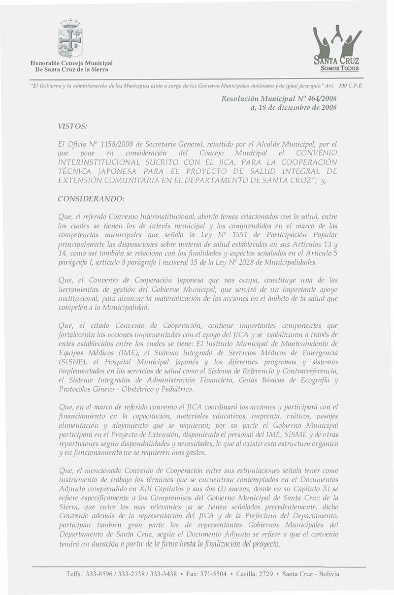 Aprueba el “Convenio de Cooperación Técnica Japonesa para el Proyecto de Salud Integral de Extensión Comunitaria en el Departamento de Santa Cruz”, suscrito entre el Gobierno Municipal de Santa Cruz, la Prefectura del Departamento de Santa Cruz y la Agencia de Cooperación Internacional del Japón (JICA).