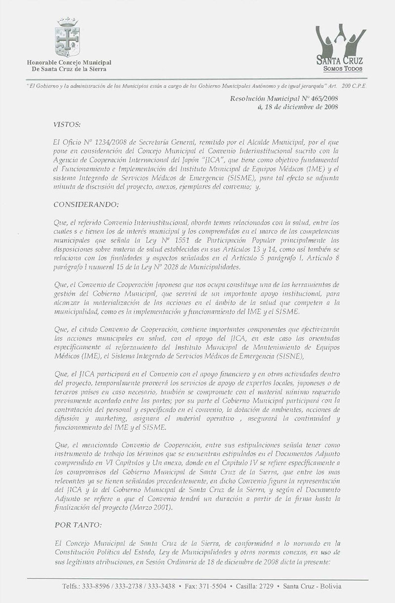 Aprueba el Convenio Interinstitucional suscrito con la Agencia de Cooperación Internacional del Japón “JICA”, que tiene como objetivo fundamental el funcionamiento e implementación del Instituto Municipal de Equipos Médicos (IME) y el Sistema Integrado de Servicios Médicos de Emergencia (SISME).