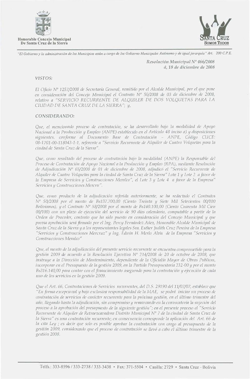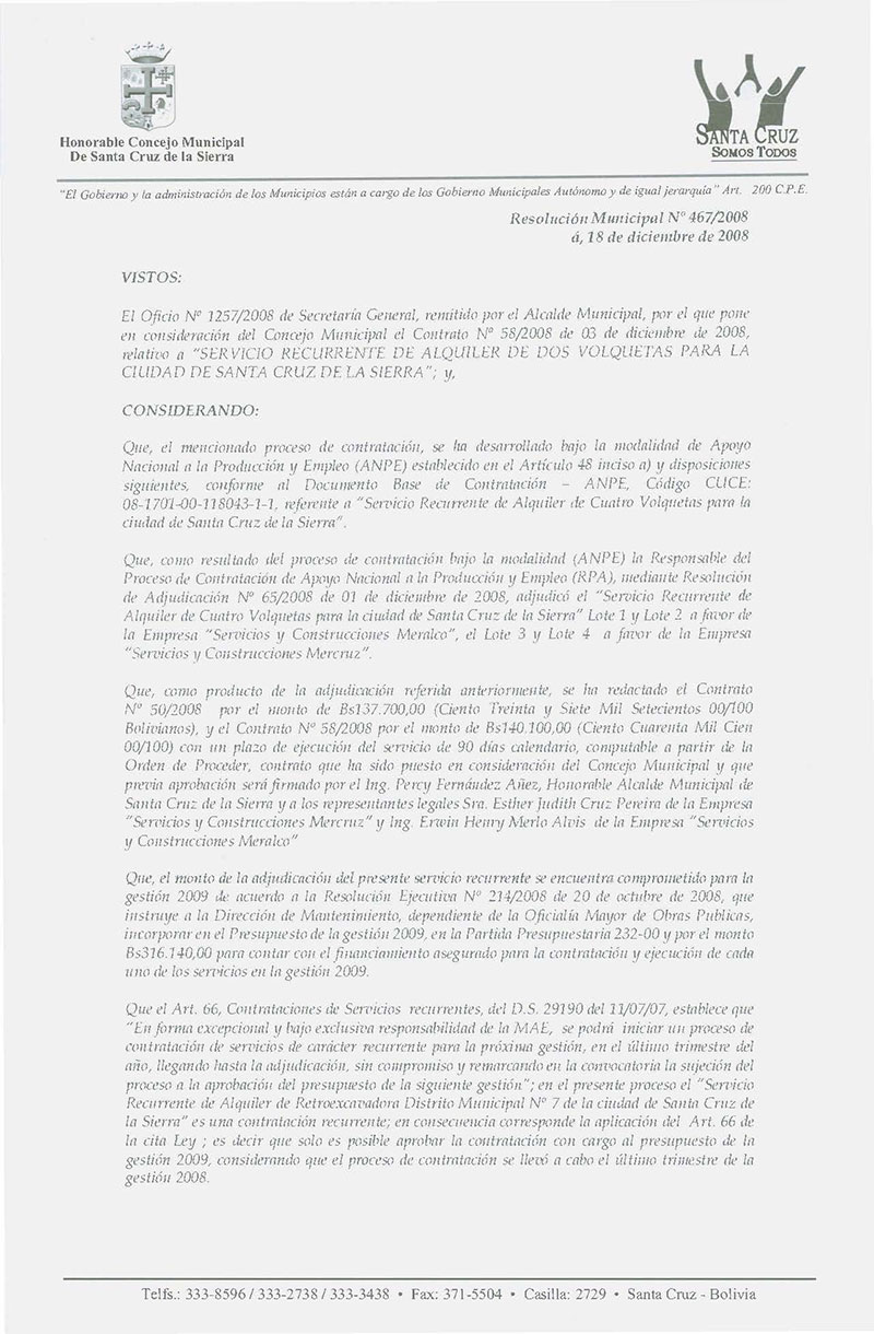 Aprueba el Contrato Nº 58/2008 de 03 de diciembre de 2008, por el monto de Bs. 140.100.00.- (CIENTO CUARENTA MIL CIEN 00/100 BOLIVIANOS), para el “SERVICIO RECURRENTE DE ALQUILER DE DOS VOLQUETAS PARA LA CIUDAD DE SANTA CRUZ DE LA SIERRA” adjudicado a la “Empresa Servicios y Construcciones Mercruz”.