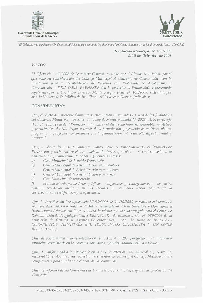 Aprueba el Convenio Marco de Cooperación entre el Gobierno Municipal Autónomo de Santa Cruz de la Sierra y la Fundación para la Rehabilitación de Personas con Problemas de Alcoholismo y Drogadicción EBENEZER SANTA CRUZ (F.R.A.D.E.S).