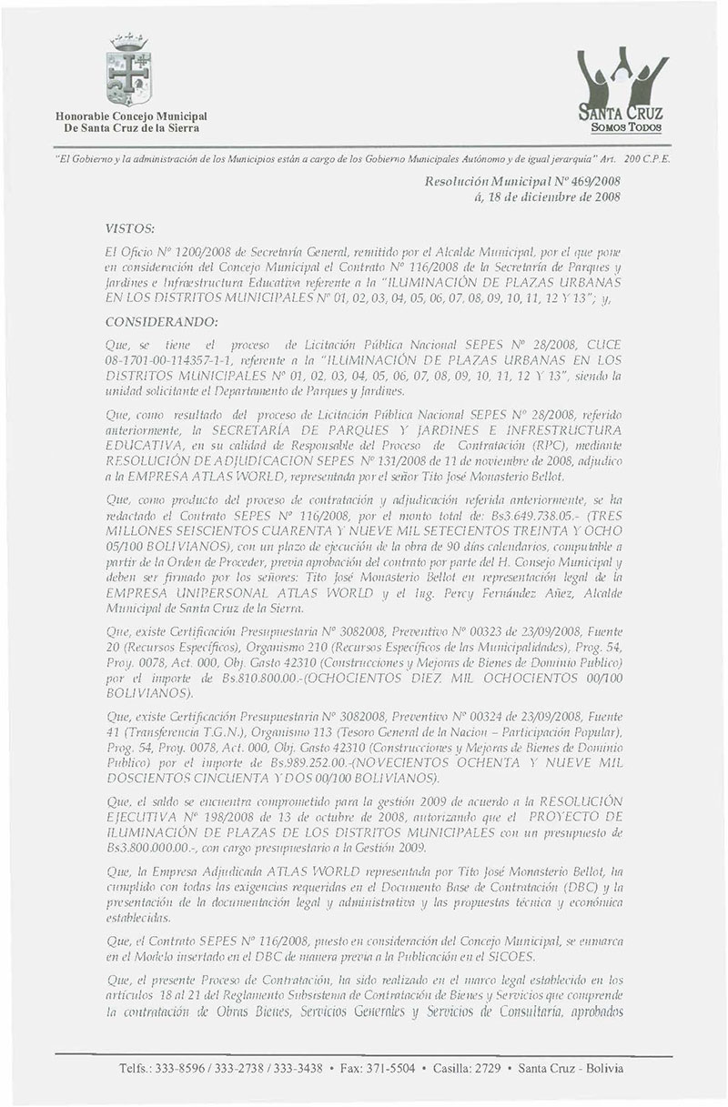 Aprueba el Contrato Nº 116/2008 de la Secretaría de Parques y Jardines e Infraestructura Educativa, por el monto total de Bs. 3.649.738.05.- (TRES MILLONES SEISCIENTOS CUARENTA Y NUEVE MIL SETECIENTOS TREINTA Y OCHO 05/100 BOLIVIANOS), para la “ILUMINACIÓN DE PLAZAS URBANAS EN LOS DISTRITOS MUNICIPALES Nº 01, 02, 03, 04, 05, 06, 07, 08, 09, 10, 11, 12 Y 13” a suscribirse con la EMPRESA UNIPERSONAL ATLAS WORLD.