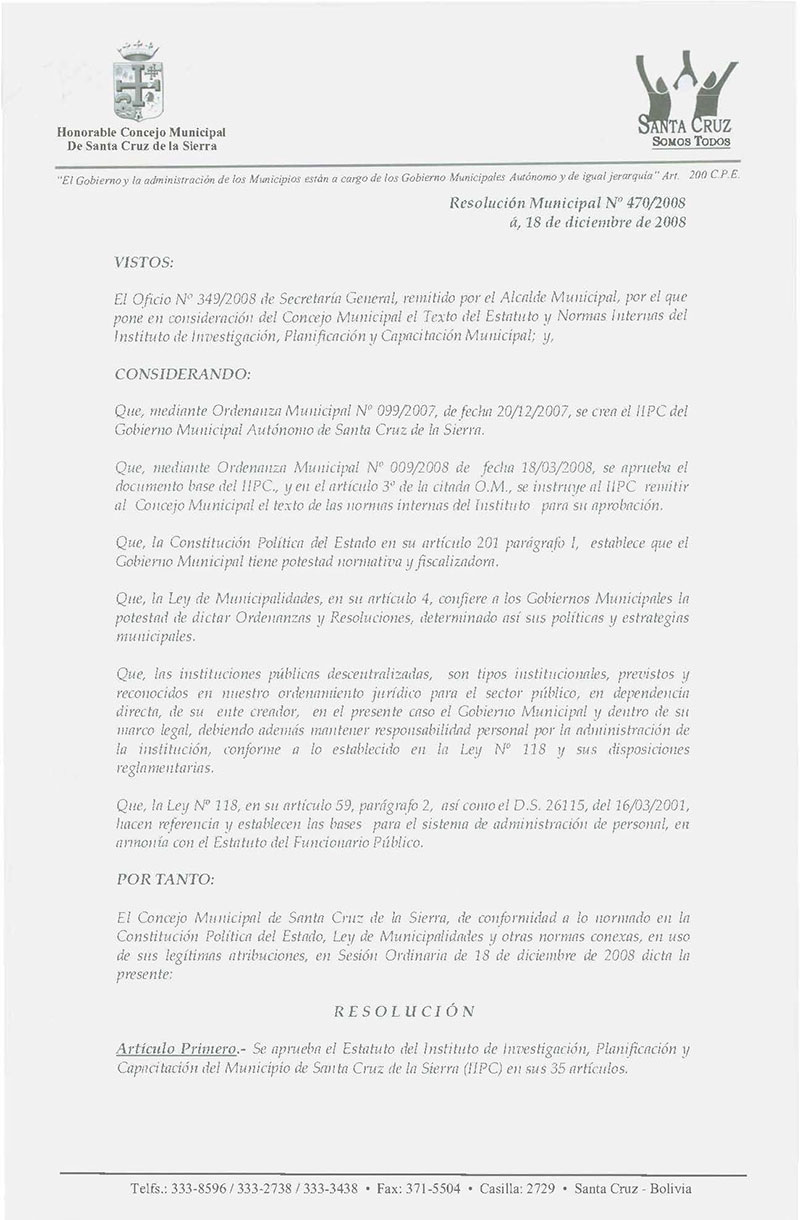 Aprueba el Estatuto del Instituto de Investigación, Planificación y Capacitación del Municipio de Santa Cruz de la Sierra (IIPC), en sus 35 Artículos.