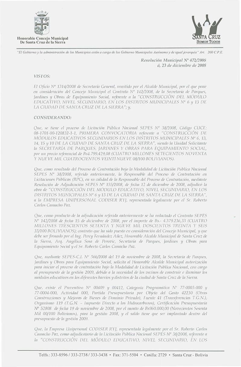 Aprueba el Contrato Nº 142/2008, de fecha 15 de diciembre de 2008, de la Secretaría de Parques, Jardines y Obras de Equipamiento Social, referente a la “CONSTRUCCIÓN DEL MÓDULO EDUCATIVO, NIVEL SECUNDARIO, EN LOS DISTRITOS MUNICIPALES Nº 6 y 13 DE LA CIUDAD DE SANTA CRUZ DE LA SIERRA”, por el valor de Bs. 4.379.236,33.- (CUATRO MILLONES TRESCIENTOS SETENTA Y NUEVE MIL DOSCIENTOS TREINTA Y SEIS 33/100 BOLIVIANOS), adjudicado a la Empresa Unipersonal CODISER RYJ.