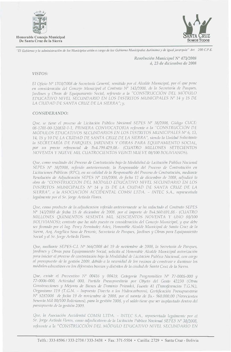 Aprueba el Contrato Nº 143/2008, de fecha 15 de diciembre de 2008, de la Secretaría de Parques, Jardines y Obras de Equipamiento Social, referente a la “CONSTRUCCIÓN DEL MÓDULO EDUCATIVO NIVEL SECUNDARIO EN LOS DISTRITOS MUNICIPALES Nº 14 y 15 DE LA CIUDAD DE SANTA CRUZ DE LA SIERRA”, por el valor de Bs. 4.560.691,88 (CUATRO MILLONES QUINIENTOS SESENTA MIL SEISCIENTOS NOVENTA Y UNO 88/100 BOLIVIANOS), adjudicado a la Asociación Accidental COMSI LTDA. – INTEC S.A.