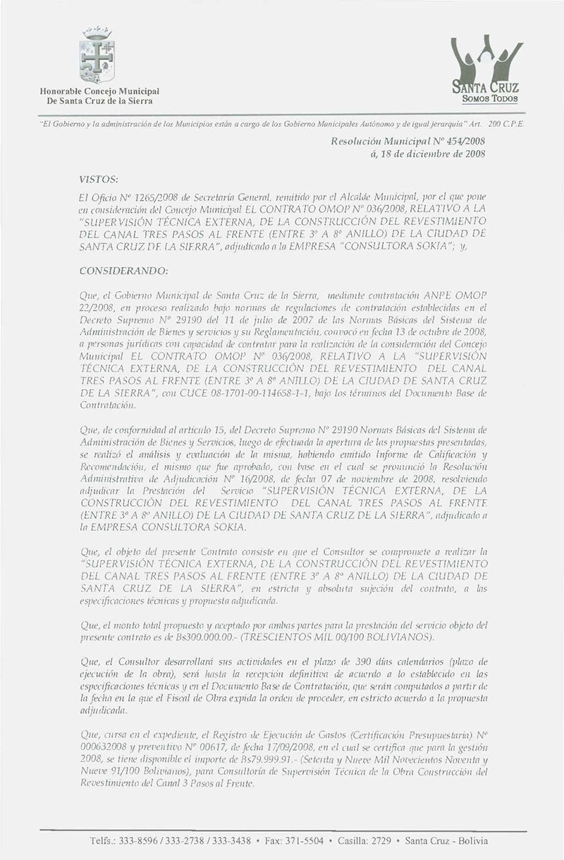 Aprueba el CONTRATO Nº 036/2008 de la Oficialía Mayor de Obras Públicas, referente a la “SUPERVISIÓN TÉCNICA EXTERNA DE LA CONSTRUCCIÓN DEL REVESTIMIENTO DEL CANAL TRES PASOS AL FRENTE (ENTRE 3º A 8º ANILLO) DE LA CIUDAD DE SANTA CRUZ DE LA SIERRA”, adjudicado a la Empresa “CONSULTORA SOKIA”, por un monto de Bs 300.000,00.- (TRESCIENTOS MIL 00/100 BOLIVIANOS).