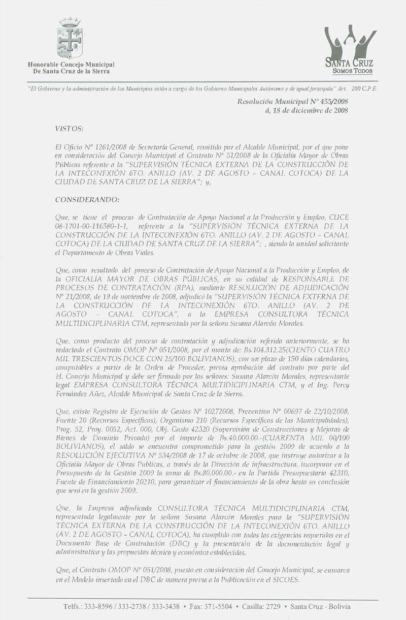 Aprueba el Contrato Nº 51/2008 de la Oficialía Mayor de Obras Públicas, por el monto de: Bs. 104.312.25(CIENTO CUATRO MIL TRESCIENTOS DOCE CON 25/100 BOLIVIANOS), para la “SUPERVISIÓN TÉCNICA EXTERNA DE LA CONSTRUCCIÓN DE LA INTECONEXIÓN 6TO. ANILLO (AV. 2 DE AGOSTO – CANAL COTOCA) DE LA CIUDAD DE SANTA CRUZ DE LA SIERRA” a suscribirse con la EMPRESA CONSULTORA TÉCNICA MULTIDISCIPLINARIA CTM.