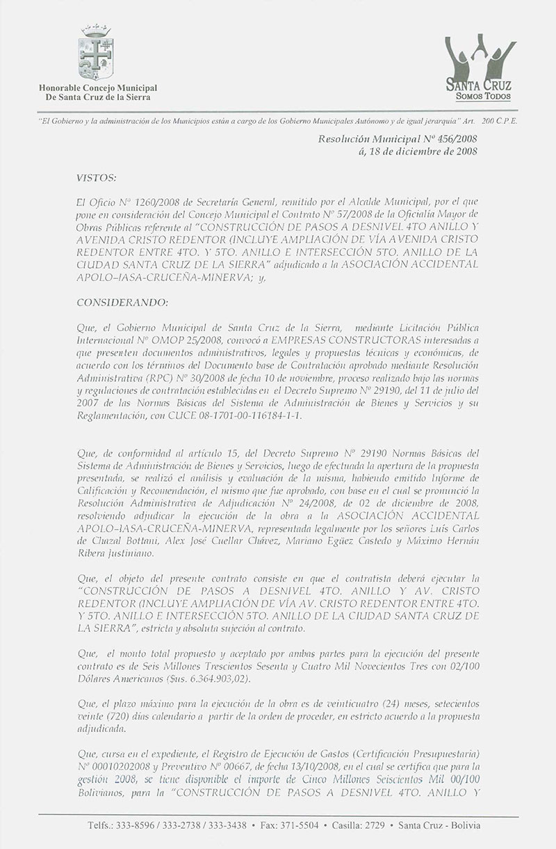 Aprueba el el Contrato Nº 57/2008 de la Oficialía Mayor de Obras Públicas referente al “CONSTRUCCIÓN DE PASOS A DESNIVEL 4° ANILLO Y AVENIDA CRISTO REDENTOR (INCLUYE AMPLIACIÓN DE VÍA AVENIDA CRISTO REDENTOR ENTRE 4° Y 5° ANILLO E INTERSECCIÓN 5° ANILLO DE LA CIUDAD SANTA CRUZ DE LA SIERRA, adjudicado a la ASOCIACIÓN ACCIDENTAL APOLO–IASA-CRUCEÑA-MINERVA, por un monto de SEIS MILLONES TRESCIENTOS SESENTA Y CUATRO MIL NOVECIENTOS TRES CON 02/100 DÓLARES AMERICANOS ($us. 6.364.903,02).