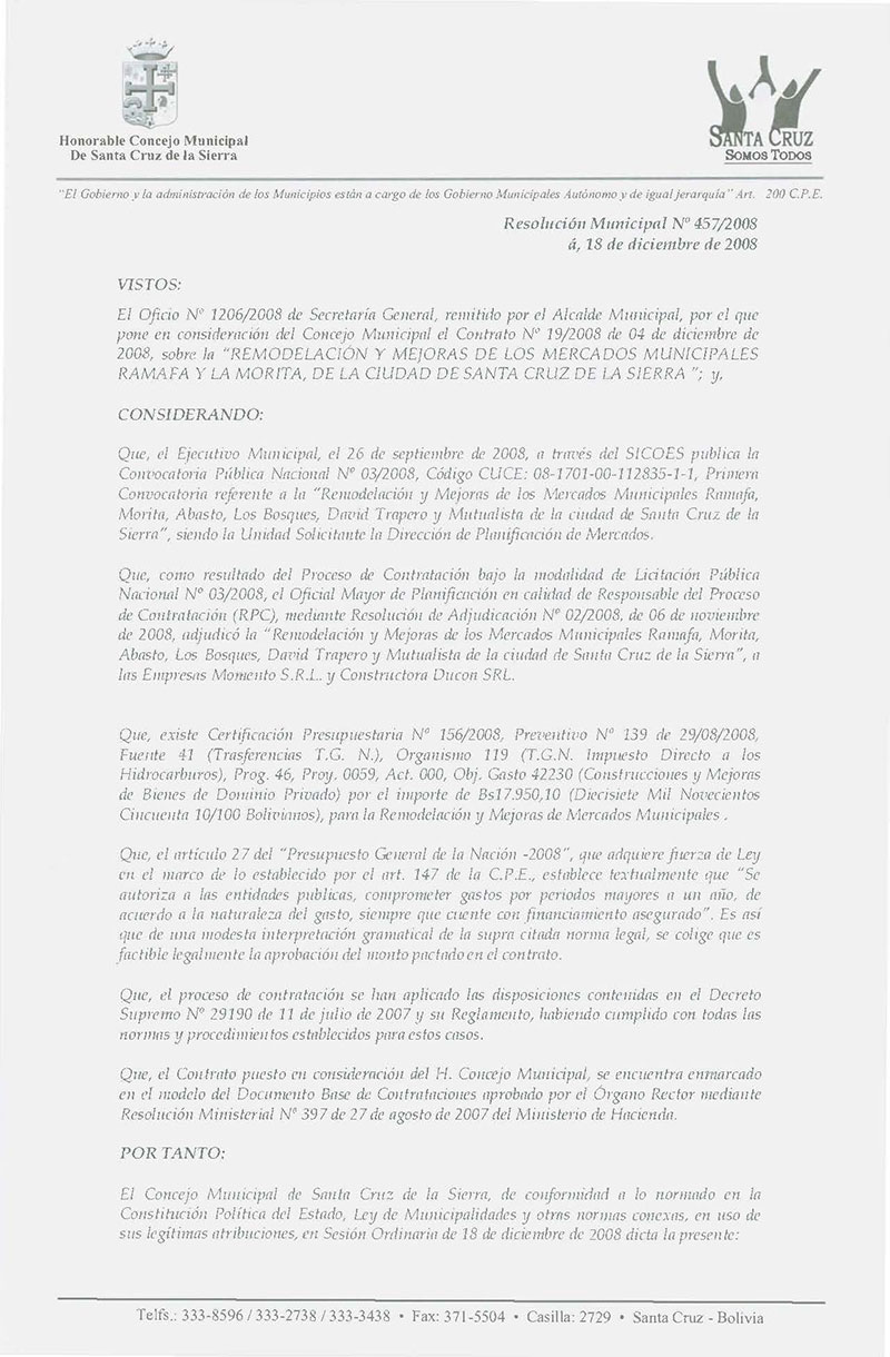 Aprueba el Contrato Nº 19/2008 de 04 de diciembre de 2008, de la Oficialía Mayor de Planificación, referente a la “REMODELACIÓN Y MEJORAS DE LOS MERCADOS MUNICIPALES RAMAFA Y LA MORITA DE LA CIUDAD DE SANTA CRUZ DE LA SIERRA”, (Paquete Uno) por el monto de Bs. 1.194.120,10.- (UN MILLÓN CIENTO NOVENTA Y CUATRO MIL CIENTO VEINTE 10/100 BOLIVIANOS), adjudicado a la Empresa Momento SRL.