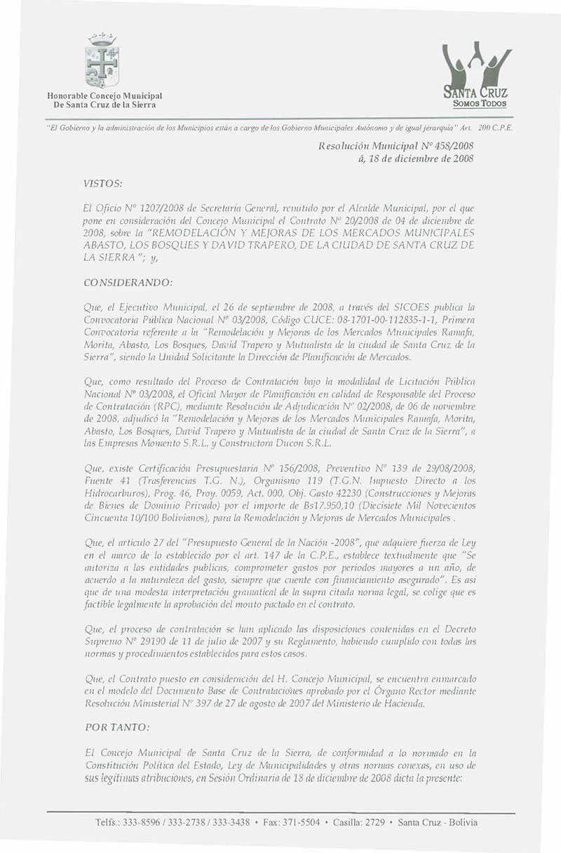 Aprueba el Contrato Nº 20/2008 de la Oficialía Mayor de Planificación, referente a la “REMODELACIÓN Y MEJORAS DE LOS MERCADOS MUNICIPALES ABASTO, LOS BOSQUES Y DAVID TRAPERO DE LA CIUDAD DE SANTA CRUZ DE LA SIERRA”, (Paquete 2) por el monto de Bs. 1.00.6.114,06 (UN MILLÓN SEIS MIL CIENTO CATORCE 06/100 BOLIVIANOS), adjudicado a la Empresa Momento S.R.L.
