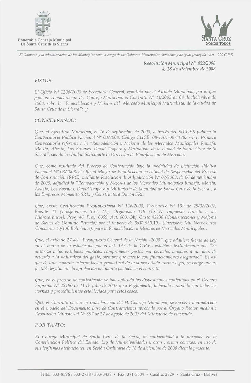 Aprueba el Contrato Nº 21/2008 de la Oficialía Mayor de Planificación, referente a la “REMODELACIÓN Y MEJORAS DEL MERCADO MUNICIPAL MUTUALISTA DE LA CIUDAD DE SANTA CRUZ DE LA SIERRA”, (Paquete 3) por el monto de Bs. 1.226.529,06.- (UN MILLÓN DOSCIENTOS VEINTISÉIS MIL QUINIENTOS VEINTINUEVE 06/100 BOLIVIANOS), adjudicado a la Empresa Constructora Ducon SRL.