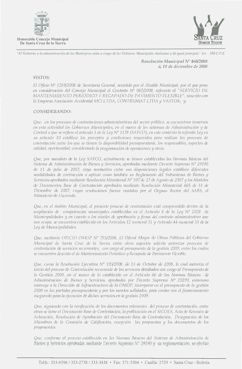 Aprueba el CONTRATO Nº 67/2008A de la Oficalía Mayor de Obras Públicas referente al “SERVICIO DE MANTENIMIENTO PERIÓDICO Y RECAPADO DE PAVIMENTO FLEXIBLE DE LA CIUDAD DE SANTA CRUZ DE LA SIERRA”, en su TRAMO II por un monto de Bs. 11.267.938.00.- (ONCE MILLONES DOSCIENTOS SESENTA Y SIETE MIL NOVECIENTOS TREINTA Y OCHO, 00/100 BOLIVIANOS), a suscribirse con la Asociación Accidental MCI – CONTRUMAT – VASTOK, como PROVEEDOR.