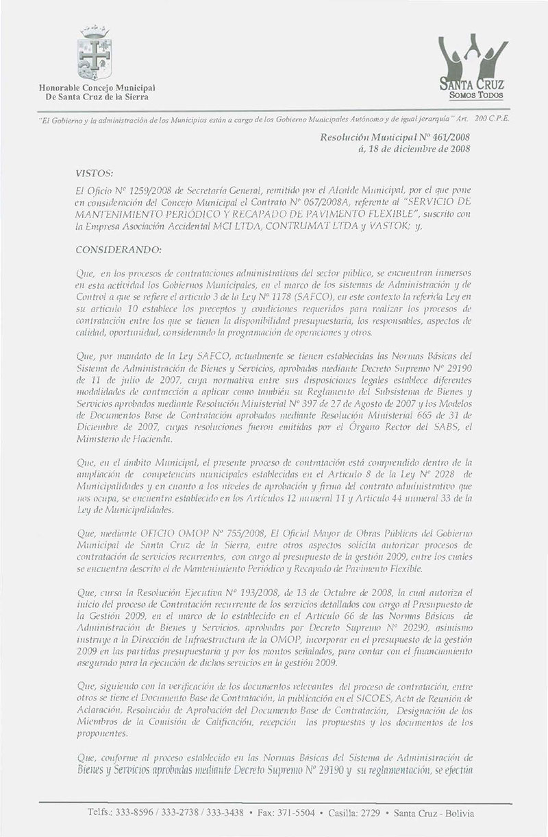 Aprueba el CONTRATO Nº 67/2008 de la Oficalía Mayor de obras Públicas, referente al “SERVICIO DE MANTENIMIENTO PERIÓDICO Y RECAPADO DE PAVIMENTO FLEXIBLE DE LA CIUDAD DE SANTA CRUZ DE LA SIERRA”, en su TRAMO I por un monto de Bs. 9.872.955,24.- (NUEVE MILLONES OCHOCIENTOS SETENTA Y DOS MIL NOVECIENTOS CINCUENTA Y CINCO, 24/100 BOLIVIANOS), a suscribirse con la Asociación Accidental APOLO – IASA.