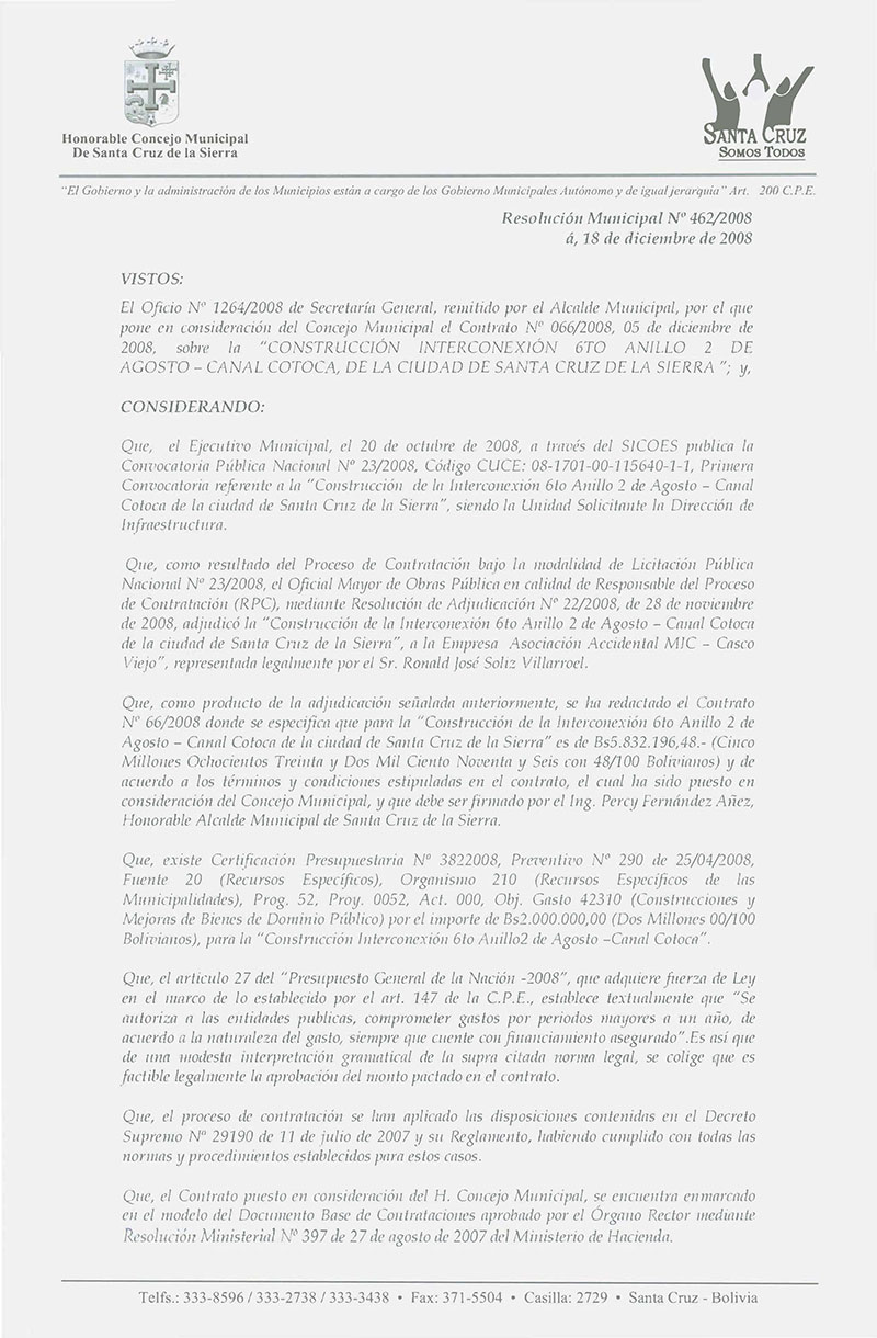 Aprueba el Contrato Nº 66/2008 de la Oficialía Mayor de Obras Públicas, por el monto de Bs. 5.832.196,48.- (CINCO MILLONES OCHOCIENTOS TREINTA Y DOS MIL CIENTO NOVENTA Y SEIS CON 48/100 BOLIVIANOS), del Proceso de Contratación de Licitación Pública Nacional Nº 23/2008, para la “Construcción Interconexión 6to Anillo 2 de Agosto – Canal Cotoca de la ciudad de Santa Cruz de la Sierra”, adjudicado a la Asociación Accidental MIC – Casco Viejo.