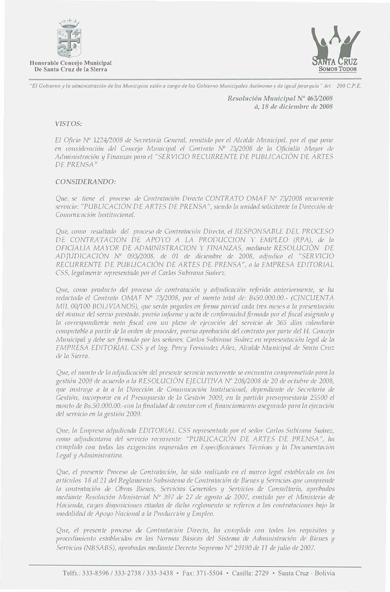 Aprueba el Contrato Nº 73/2008 de la Oficialía Mayor de Administración y Finanzas, por contratación directa para el “SERVICIO RECURRENTE DE PUBLICACIÓN DE ARTE DE PRENSA”, por el monto total de Bs. 50.000.00.-(CINCUENTA MIL 00/100 BOLIVIANOS), a suscribirse con la EMPRESA EDITORIAL CSS.