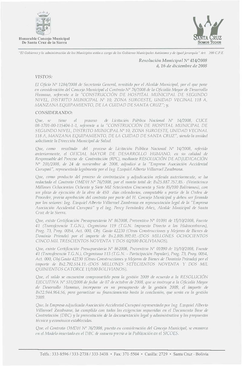 Aprueba el Contrato Nº 76/2008 de la Oficialía Mayor de Desarrollo Humano, referente a la “CONSTRUCCIÓN DE HOSPITAL MUNICIPAL DE SEGUNDO NIVEL, DISTRITO MUNICIPAL Nº 10, ZONA SUROESTE, UNIDAD VECINAL 118 A, MANZANA EQUIPAMIENTO DE LA CUIDAD DE SANTA CRUZ”, por el monto total de Bs. 25.887.757,85.- (VEINTICINCO MILLONES OCHOCIENTOS OCHENTA Y SIETE MIL SETECIENTOS CINCUENTA Y SIETE 85/100 BOLIVIANOS), adjudicada a la “Empresa Asociación Accidental Curupaú”.