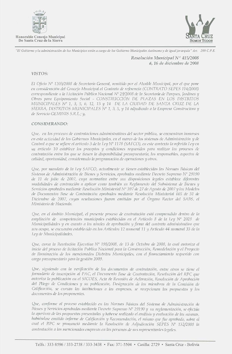 Aprueba el Contrato Nº 114 de la Secretaría de Parques, Jardines y Obras para Equipamiento Social, referente a la CONSTRUCCIÓN DE PLAZAS EN LOS DISTRITOS MUNICIPALES Nº 1, 3, 5 Y 14 (SEGUNDA ETAPA) DE LA CIUDAD DE SANTA CRUZ DE LA SIERRA, por un monto de Bs. 676.014,62.- (SEISCIENTOS SETENTA Y SEIS MIL CATORCE, 62/100 BOLIVIANOS) a ser suscrito con la Empresa Constructora y de Servicio GEMINIS E.