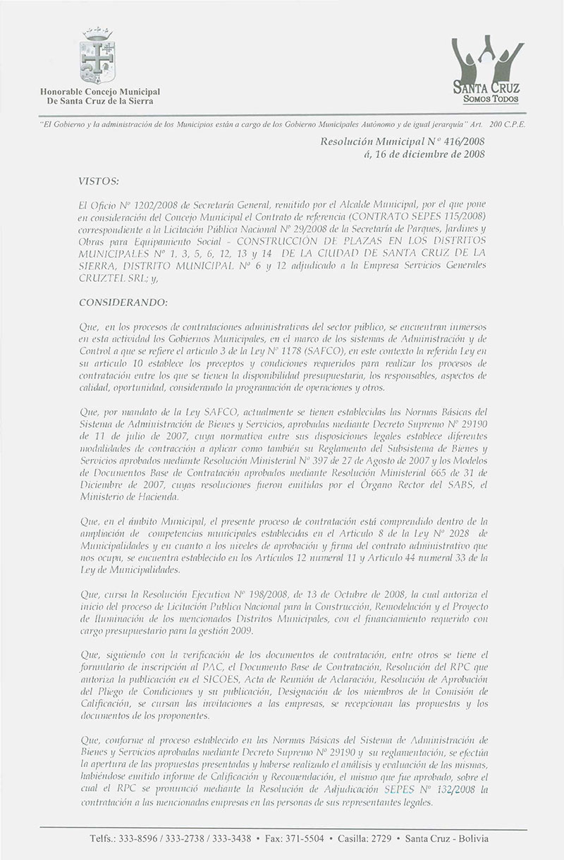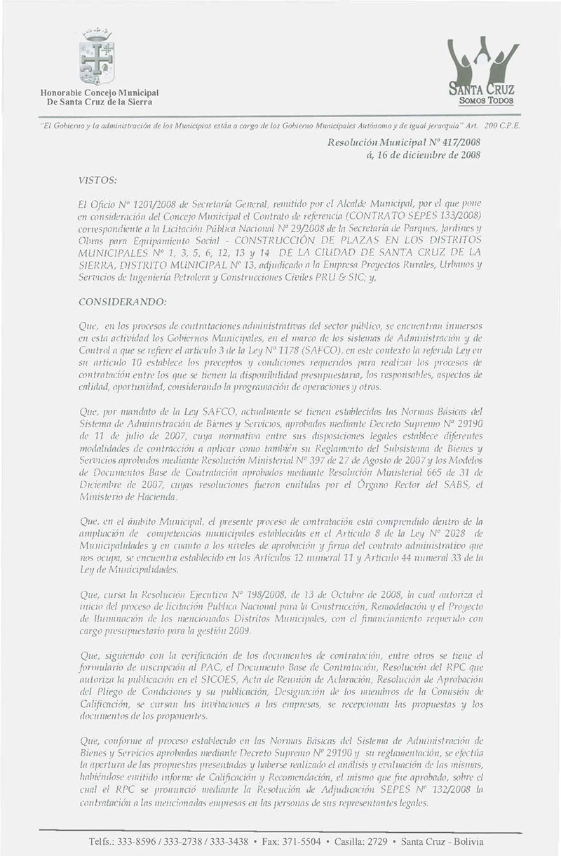Aprueba el Contrato Nº 133/2008 de la Secretaría de Parques, Jardines y Obras para Equipamiento Social, referente a la CONSTRUCCIÓN DE PLAZAS EN EL DISTRITO MUNICIPAL Nº 13 (SEGUNDA ETAPA) DE LA CIUDAD DE SANTA CRUZ DE LA SIERRA, por un monto de Bs. 318.006,04 (TRESCIENTOS DIECIOCHO MIL SEIS, 04/100 BOLIVIANOS), a ser suscrito con la Empresa Proyectos Rurales, Urbanos y Servicios de Ingeniería Petrolera y Construcciones Civiles PRU.