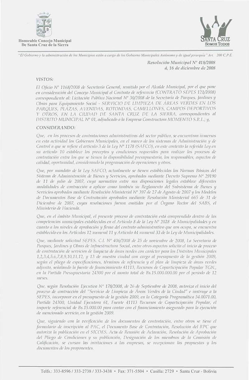 Aprueba el Contrato Nº 121 de la Secretaría de Parques, Jardines y Obras para Equipamiento Social, referente al SERVICIO DE LIMPIEZA DE ÁREAS VERDES EN LOS PARQUES, PLAZAS, AVENIDAS, ROTONDAS, CAMELLONES, CAMPOS DEPORTIVOS Y OTROS, EN LA CIUDAD DE SANTA CRUZ DE LA SIERRA, correspondiente al Distrito Municipal Nº 01, por un monto de Bs. 1.492.887,32 (UN MILLÓN CUATROCIENTOS NOVENTA Y DOS MIL OCHOCIENTOS OCHENTA Y SIETE, 32/100 BOLIVIANOS), suscrito con la Empresa Constructora MOMENTO SRL.