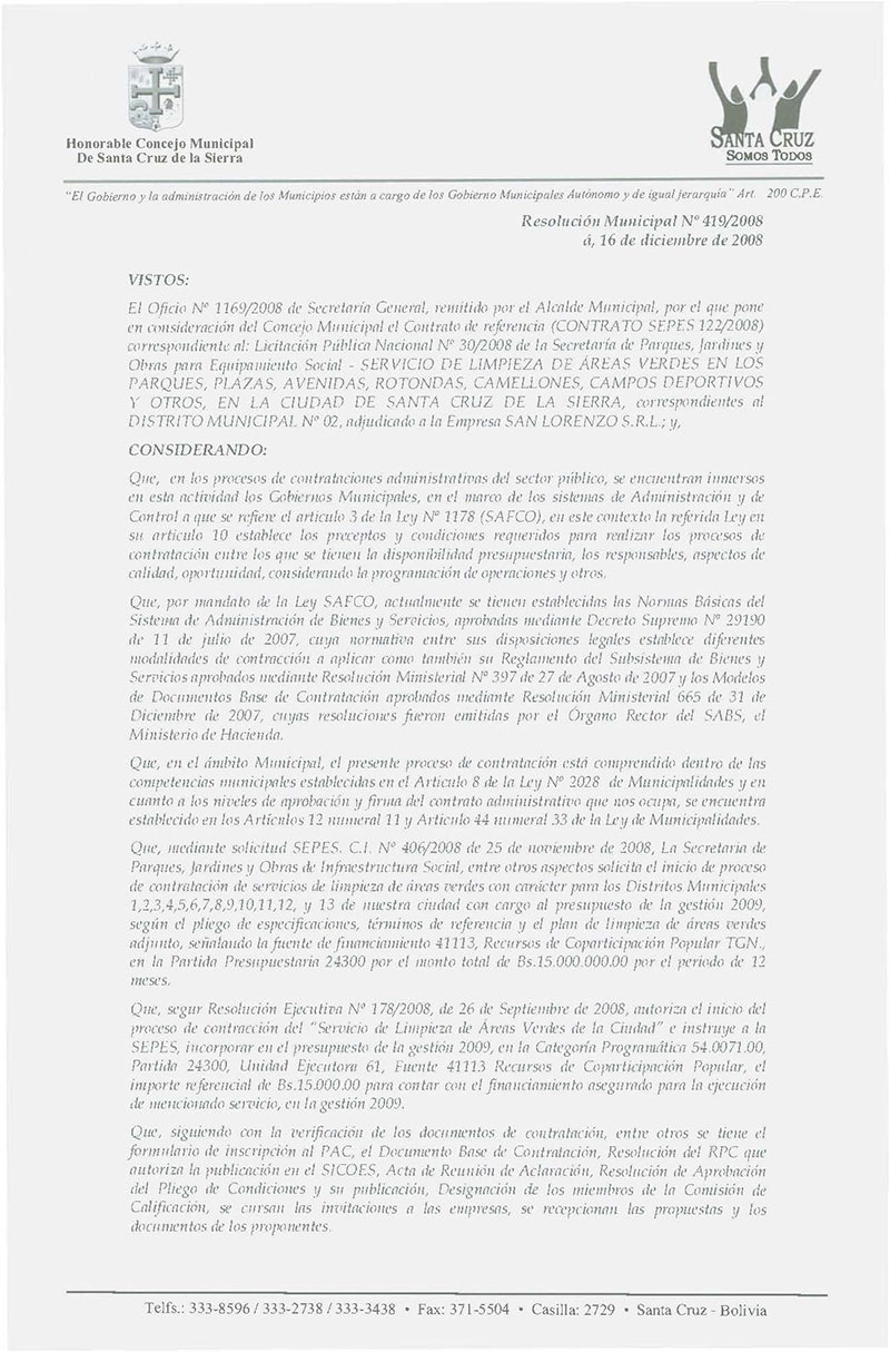 Aprueba el Contrato Nº 125 de la Secretaría de Parques, Jardines y Obras para Equipamiento Social , referente al SERVICIO DE LIMPIEZA DE ÁREAS VERDES EN LOS PARQUES, PLAZAS, AVENIDAS, ROTONDAS, CAMELLONES, CAMPOS DEPORTIVOS Y OTROS, EN LA CIUDAD DE SANTA CRUZ DE LA SIERRA, correspondiente al Distrito Municipal Nº 05, por un monto de Bs. 529.589,87.- (QUINIENTOS VEINTINUEVE MIL QUINIENTOS OCHENTA Y NUEVE, 87/100 BOLIVIANOS), adjudicado a la Empresa SAN LORENZO S.R.L.