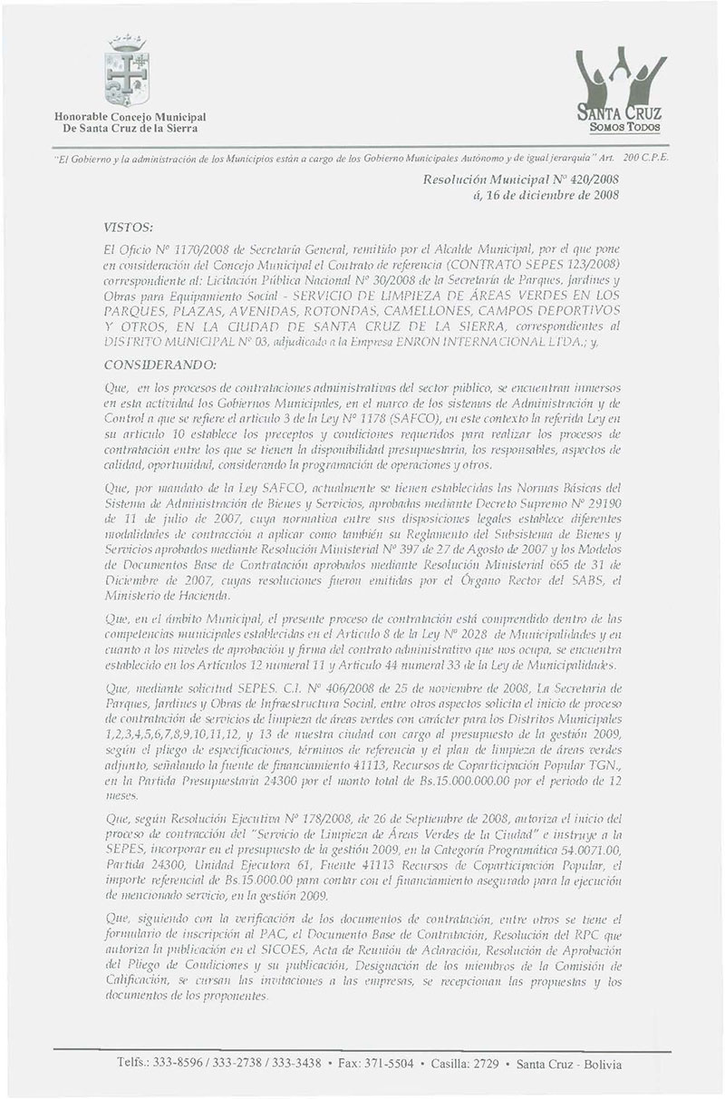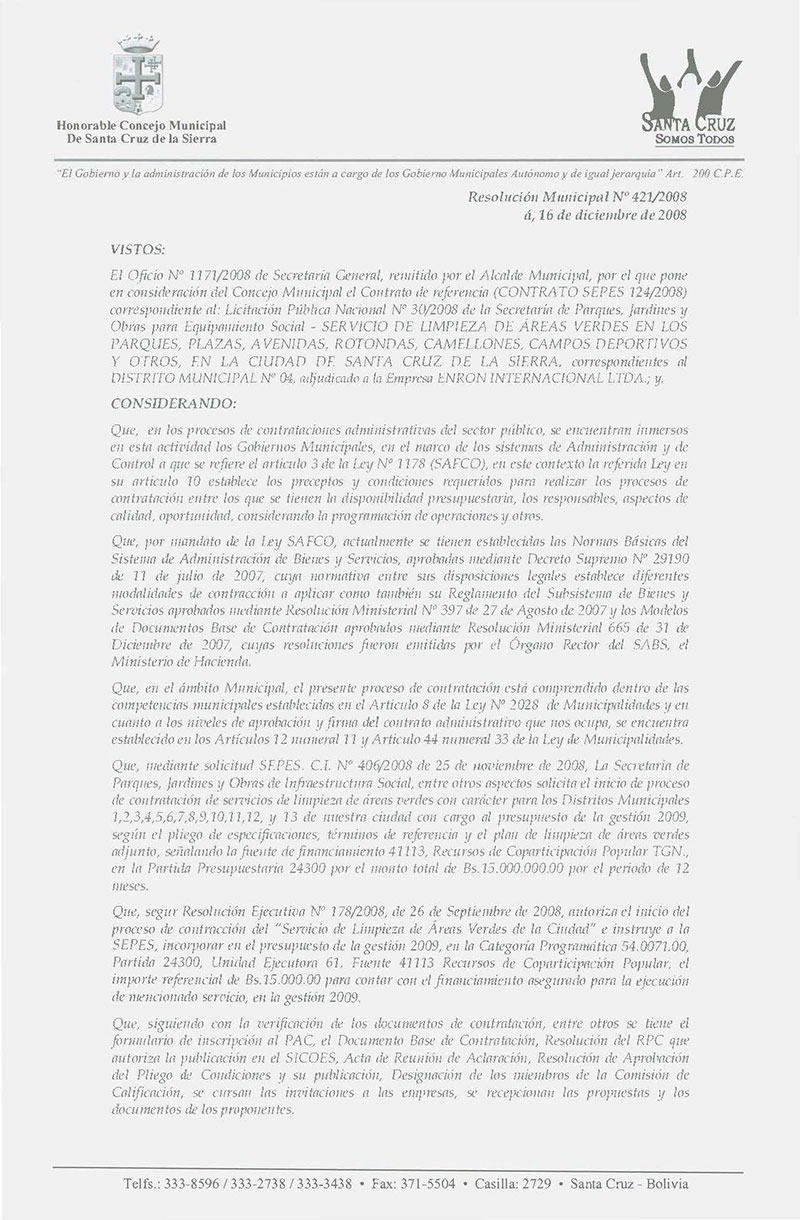 Aprueba el Contrato Nº 124 de la Secretaría de Parques, Jardines y Obras para Equipamiento Social referente al SERVICIO DE LIMPIEZA DE ÁREAS VERDES EN LOS PARQUES, PLAZAS, AVENIDAS, ROTONDAS, CAMELLONES, CAMPOS DEPORTIVOS Y OTROS, EN LA CIUDAD DE SANTA CRUZ DE LA SIERRA, correspondiente al Distrito Municipal Nº 04, por un monto de Bs. 707.633.53.- (SETECIENTOS SIETE MIL SEISCIENTOS TREINTA Y TRES, 53/100 BOLIVIANOS), adjudicado a la Empresa ENRON INTERNACIONAL LTDA.