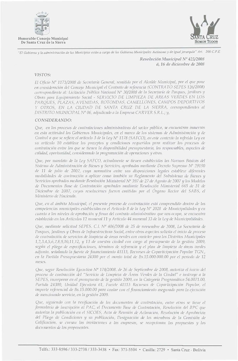 Aprueba el Contrato Nº 126 de la Secretaría de Parques, Jardines y Obras para Equipamiento Social referente al SERVICIO DE LIMPIEZA DE ÁREAS VERDES EN LOS PARQUES, PLAZAS, AVENIDAS, ROTONDAS, CAMELLONES, CAMPOS DEPORTIVOS Y OTROS EN LA CIUDAD DE SANTA CRUZ DE LA SIERRA, correspondiente al Distrito Municipal Nº 06, por un monto de Bs. 2.291.488,26 (DOS MILLONES DOSCIENTOS NOVENTA Y UN MIL CUATROCIENTOS OCHENTA Y OCHO MIL, 26/100 BOLIVIANOS), adjudicado a la Empresa CARVER SRL.