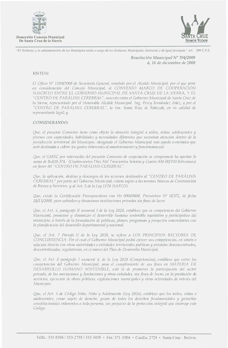 Aprueba el CONVENIO MARCO DE COOPERACIÓN SUSCRITO ENTRE EL GOBIERNO MUNICIPAL DE SANTA CRUZ DE LA SIERRA, Y EL “CENTRO DE PARÁLISIS CEREBRAL”, destinado a la atención integral a niños, niñas, adolescentes y jóvenes con capacidades, habilidades y necesidades diferentes, por el importe de Bs. 410.374.- (CUATROCIENTOS DIEZ MIL TRESCIENTOS SETENTA Y CUATRO MIL 00/100 BOLIVIANOS).