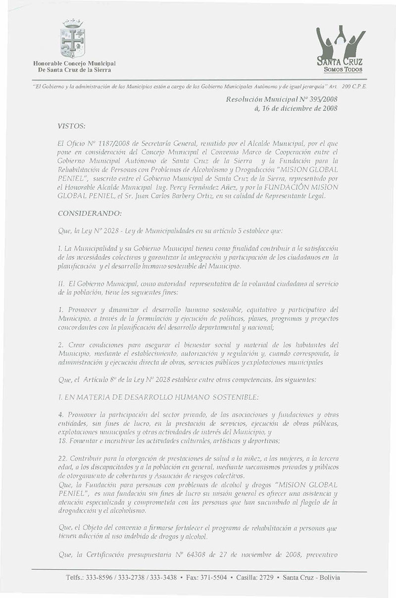 Aprueba el Convenio Marco de Cooperación entre el Gobierno Municipal Autónomo de Santa Cruz de la Sierra y la Fundación para la Rehabilitación de Personas con Problemas de Alcoholismo y Drogadicción “MISION GLOBAL PENIEL”, suscrito entre el Gobierno Municipal de Santa Cruz de la Sierra y la FUNDACIÓN MISION GLOBAL PENIEL.