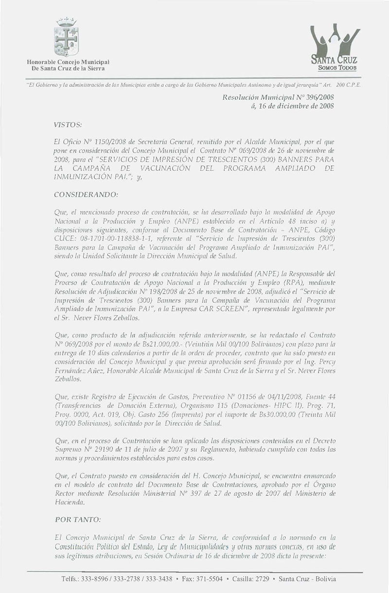 Aprueba el Contrato Nº 069/2008 de 26 de noviembre de 2008, para el “SERVICIOS DE IMPRESIÓN DE TRESCIENTOS (300) BANNERS PARA LA CAMPAÑA DE VACUNACIÓN DEL PROGRAMA AMPLIADO DE INMUNIZACIÓN PAI.” por el monto de Bs. 21.000,00.- (VEINTIÚN MIL 00/100 BOLIVIANOS), , adjudicado a la Empresa CAR SCREEN.