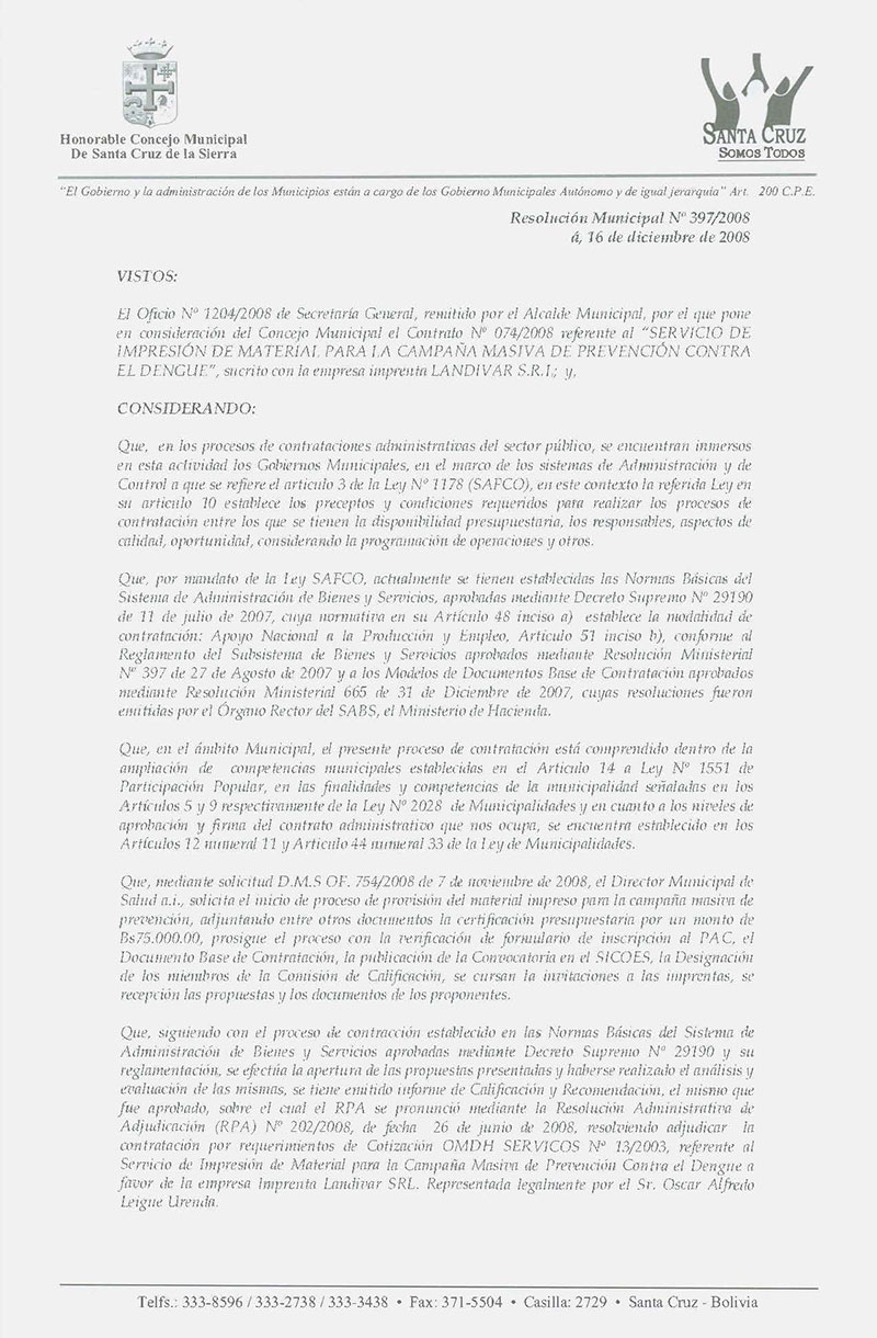 Aprueba el CONTRATO Nº 74/2008, referente al “SERVICIO DE IMPRESIÓN DE MATERIAL PARA LA CAMPAÑA MASIVA DE PREVENCIÓN CONTRA EL DENGUE”, suscrito con la empresa IMPRENTA LANDIVAR S.R.L;, por un monto de Bs. 56.800.00.- (CINCUENTA Y SEIS MIL OCHOCIENTOS 00/100 BOLIVIANOS).