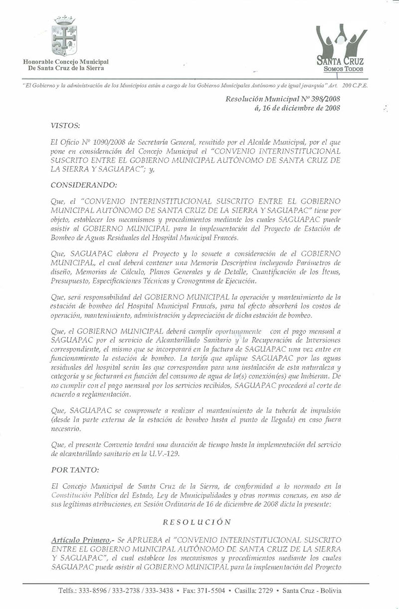 Aprueba el “CONVENIO INTERINSTITUCIONAL SUSCRITO ENTRE EL GOBIERNO MUNICIPAL AUTÓNOMO DE SANTA CRUZ DE LA SIERRA Y SAGUAPAC”, establece los mecanismos y procedimientos de asistencia al GOBIERNO MUNICIPAL DE SANTA CRUZ DE LA SIERRA para la implementación del Proyecto de Estación de Bombeo de Aguas Residuales del Hospital Municipal Francés.